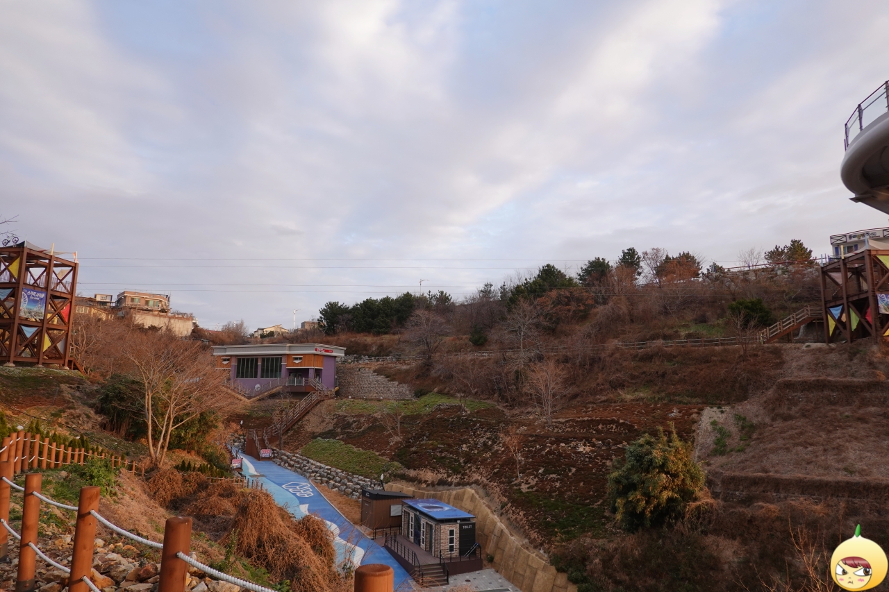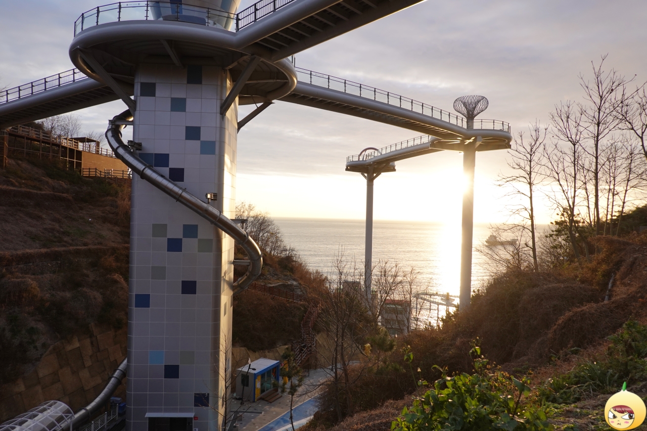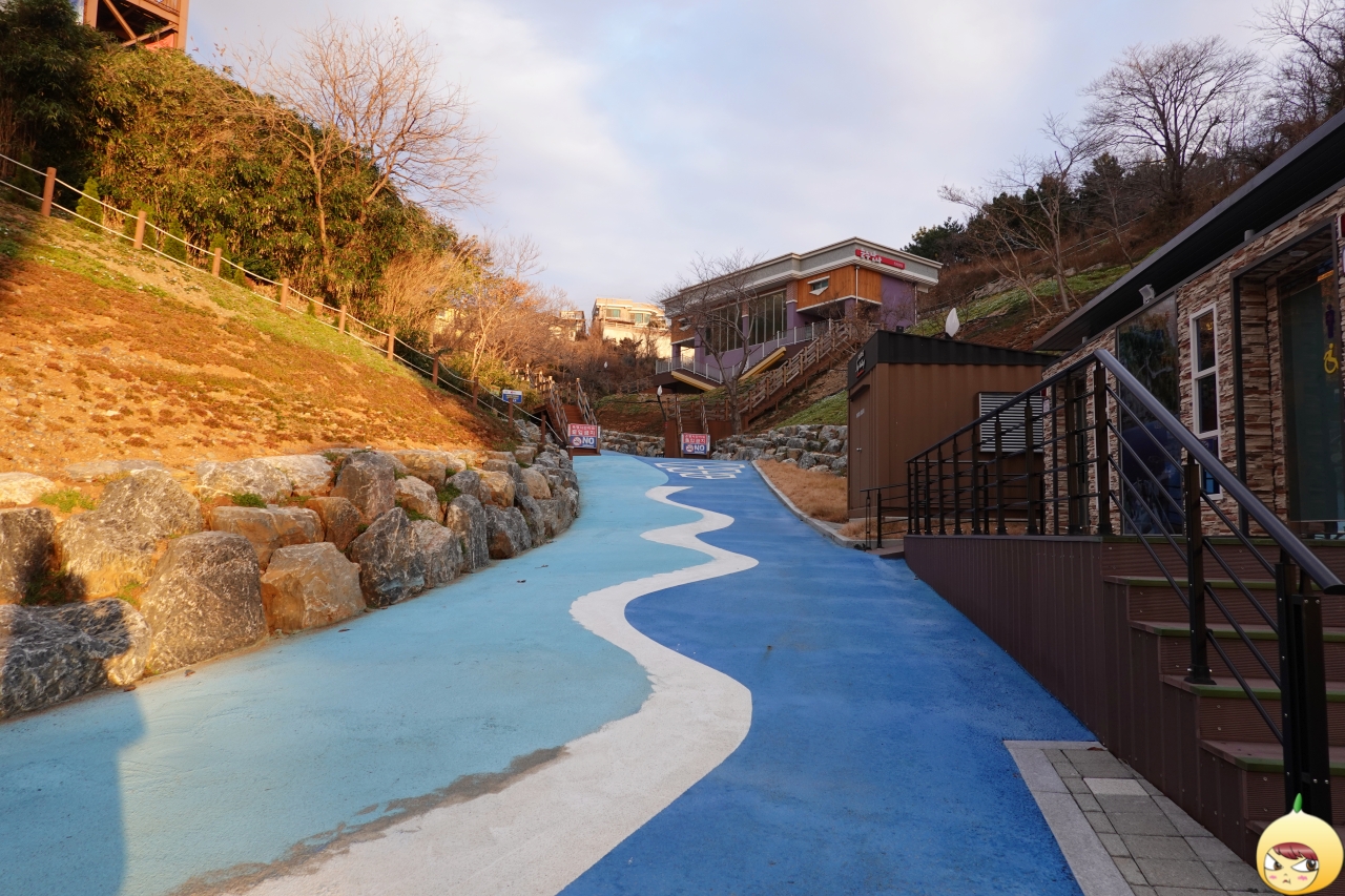 묵호등대에 가는 여러 길이 있는데, 스카이밸리 옆이 그나마 무난하다. 계단이 있긴 하지만, 오르막이 험난하지 않다. 등산보다는 가벼운 산책 느낌이다. 그나저나 스카이밸리 건물 옆으로 곡선의 무언가가 있는데, 자이언트 슬라이드란다. 그저 전망대만 있는 줄 알았는데, 무서운 녀석(?)도 있다.
