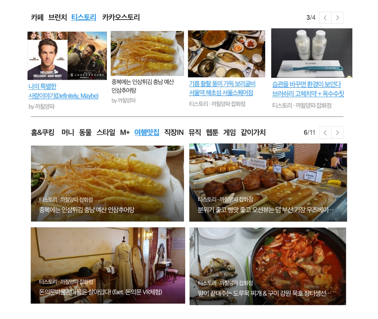 그 중에서 운이 좋아서, 글을 잘 써서, 퀄리티가 좋아서 등 어떤 이유인지 정확히는 모르지만 고맙게도 다음(Daum) 메인에 117건의 글이 노출됐다. 이는 PC와 모바일을 따로 계산을 했고, 작년에는 138건이었다. 음식이 가장 많으며, 여행과 영화(전시)도 간혹 있다. 늘 여행맛집 코너에 올라 왔는데, 딱한번 고체치약 리뷰가 홈&쿠킹 메인을 장식했다.
