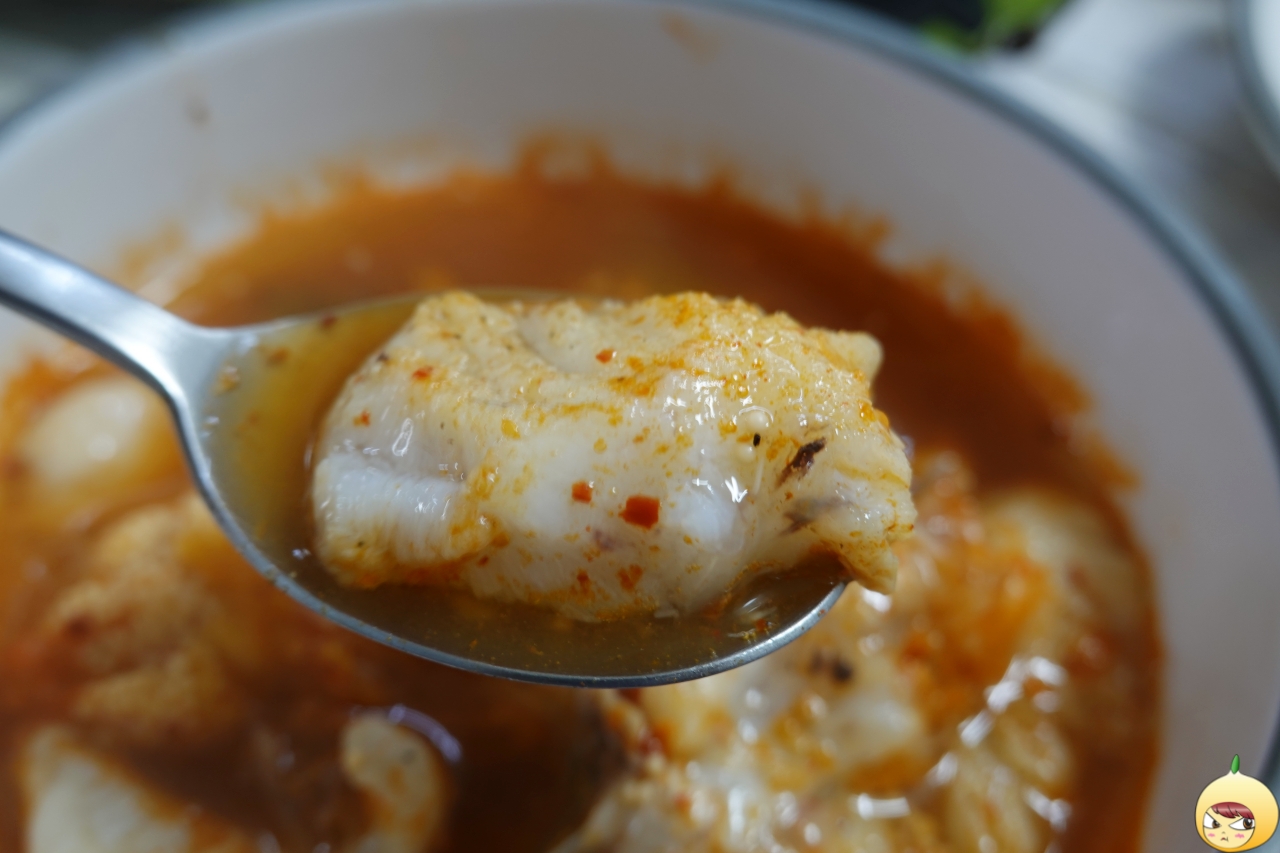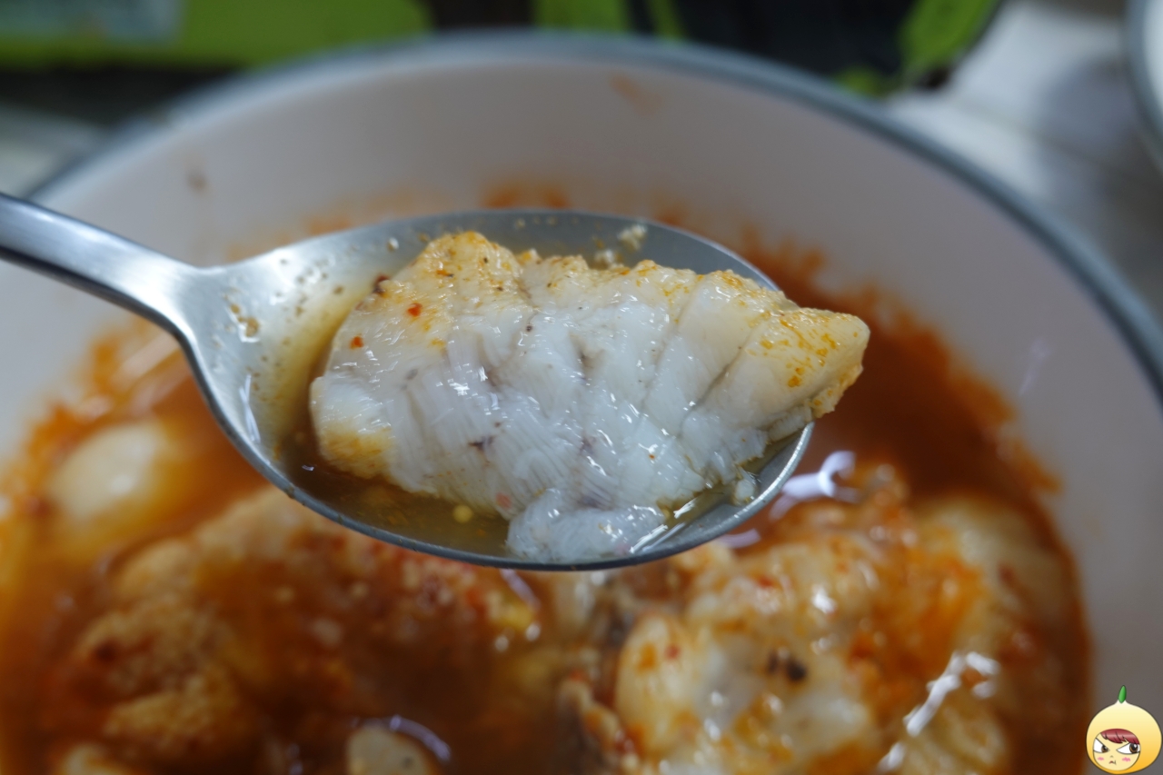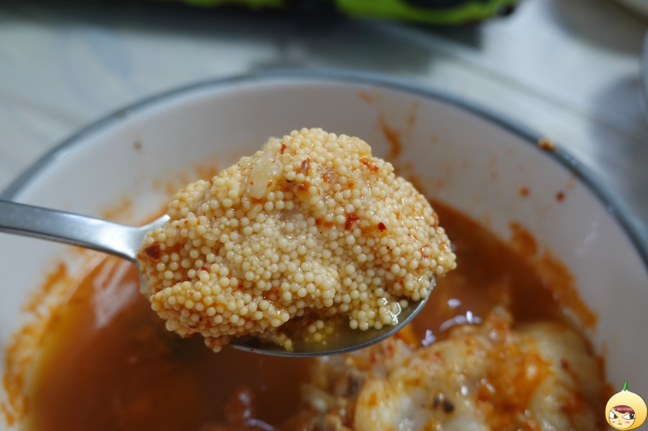 생김새는 아귀와 비슷한데, 질감은 전혀 딴판이다. 우선 흐물흐물한 생선살은 마치 부드러운 푸딩같다. 작은 알갱이는 곰치알이다.