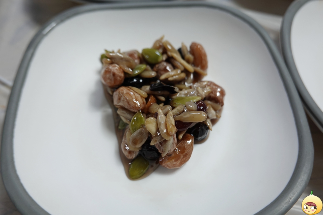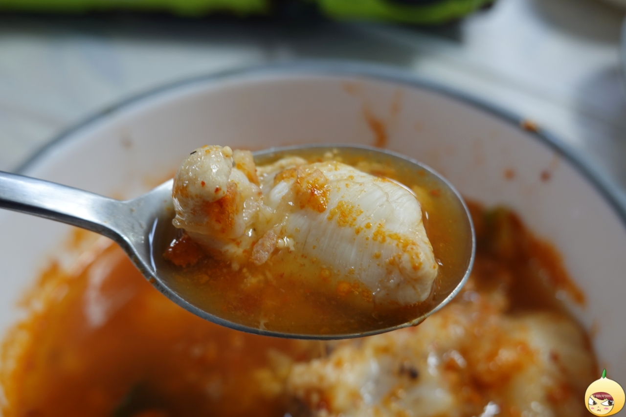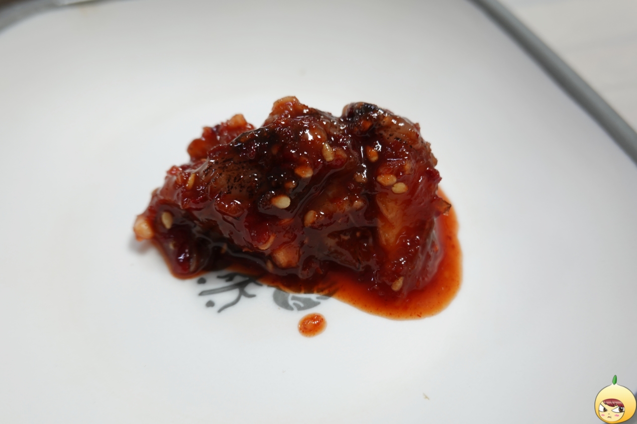 생김새는 아귀와 비슷한데, 질감은 전혀 딴판이다. 우선 흐물흐물한 생선살은 마치 부드러운 푸딩같다. 작은 알갱이는 곰치알이다.
