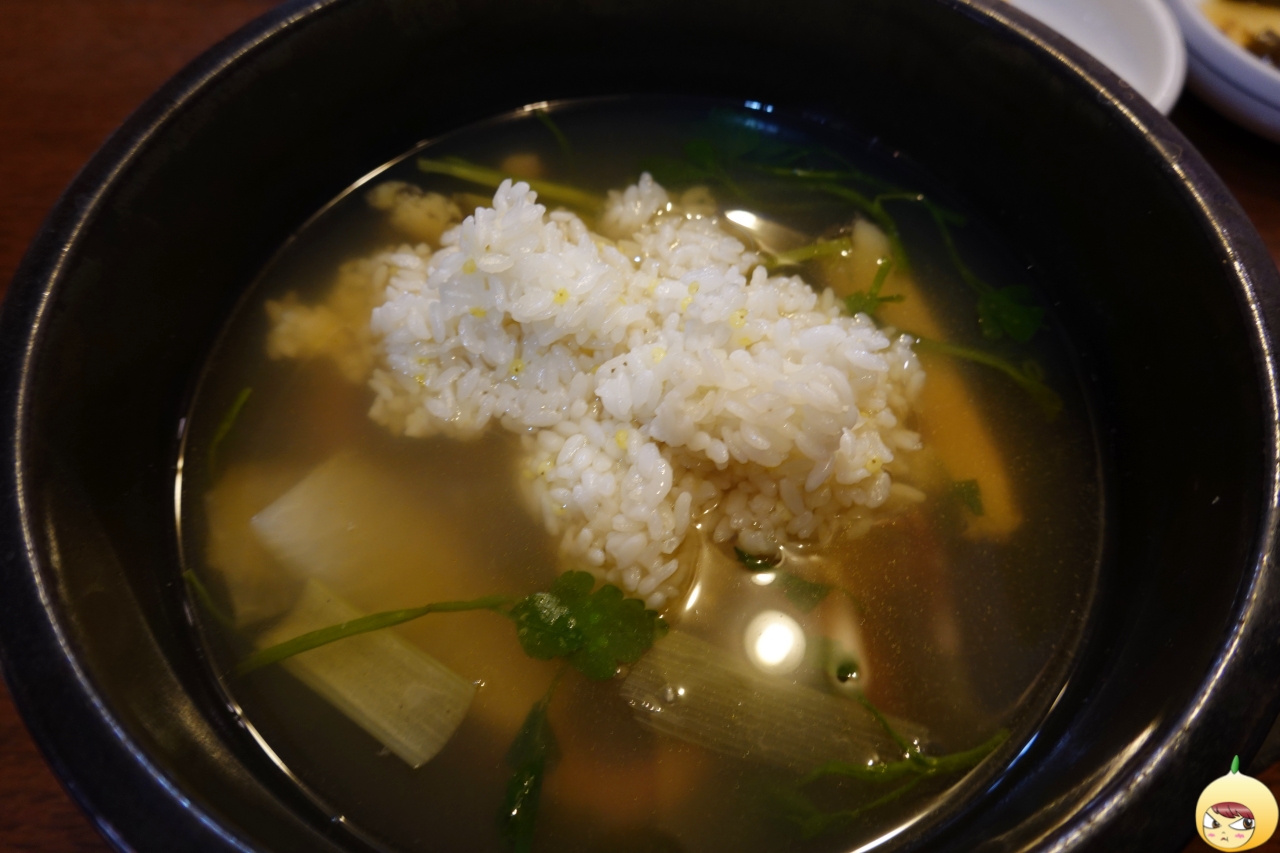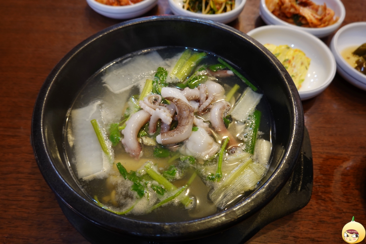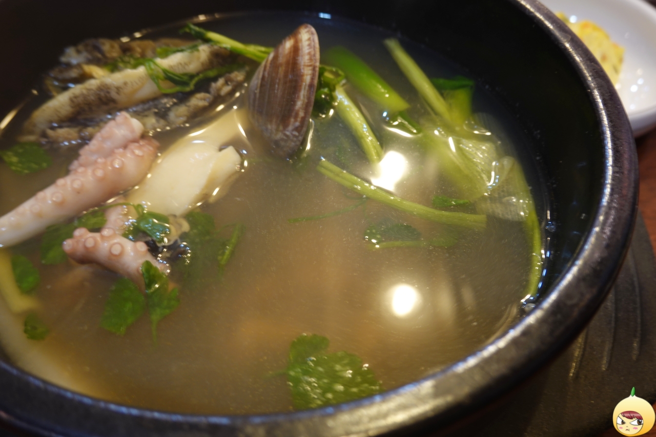 방송으로 다 보고 갔지만, 처음인 듯 연기 아닌 연기 시작. 탕이라고 해서 빨간 매운탕을 생각하면 경기도 오산이다. 맑디 맑은탕이다. 커다란 뚝배기 가득은 아니고, 2/3정도에 맑은 국물이 있고, 시원한 맛을 내는 무와 미나리가 들어있다. 그리고 낙지가 살포시 올려져 있으며, 그 아래 어딘가에 전복이 들어있다.