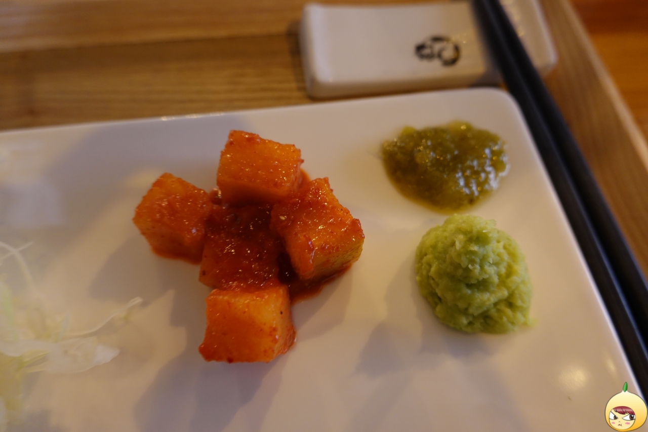 돈가스를 먹을때 양배추 샐러드는 무조건이다. 고소한 참깨드레싱은 아삭한 양배추의 맛을 더 살리고, 꽤 많이 익은 깍두기는 혹시 모를 느끼함을 잡아준다. 그리고 알싸한 와사비와 유자향이 좋은 유자후추 소스다.