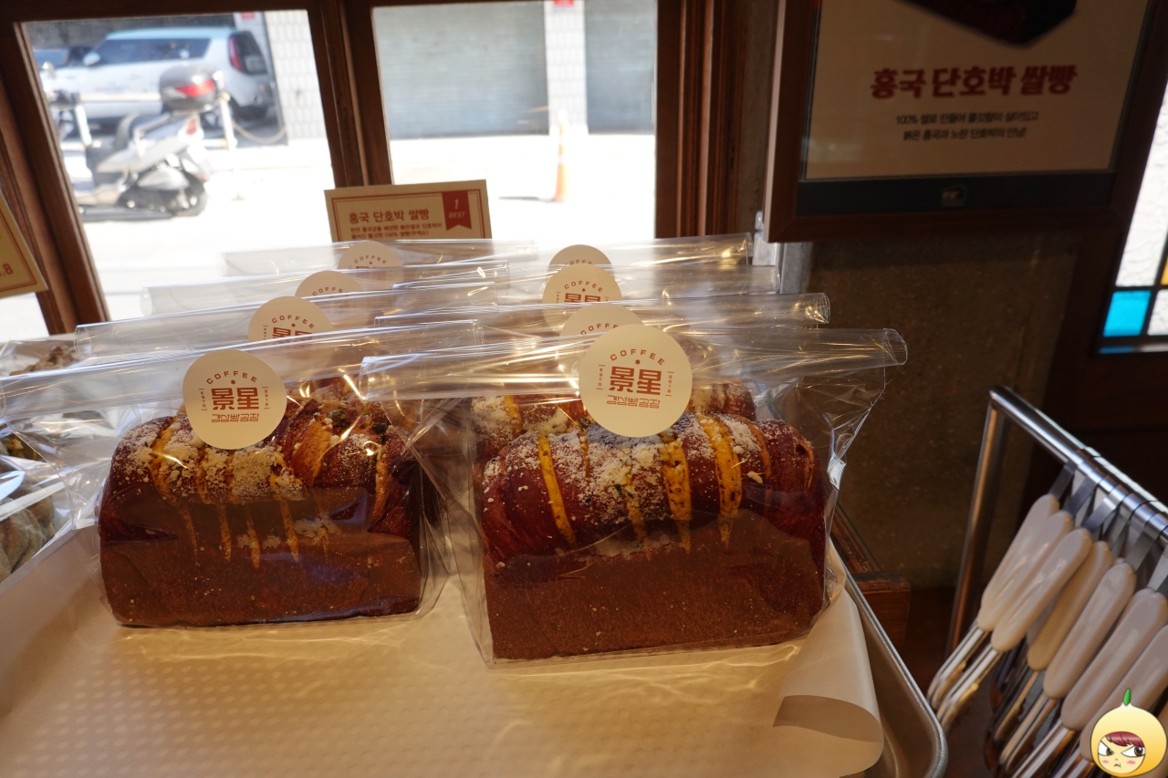 메뉴판 가장 위에 있는 메뉴가 시그니처이듯, 빵집도 그런가 보다. 직원에게 처음 왔다고 추천해 달라고 하니, 집게 옆에 있는 빵을 바로 가리킨다. 100% 쌀로 만든 홍국단호박쌀빵이다. 홍국쌀로 만든 술을 마셔봤는데, 빵은 처음이다. 그 옆은 베스트2 찹쌀쑥떡쑥떡이고, 또 그 옆은 베스트3 잡곡쌀 앙버터다.