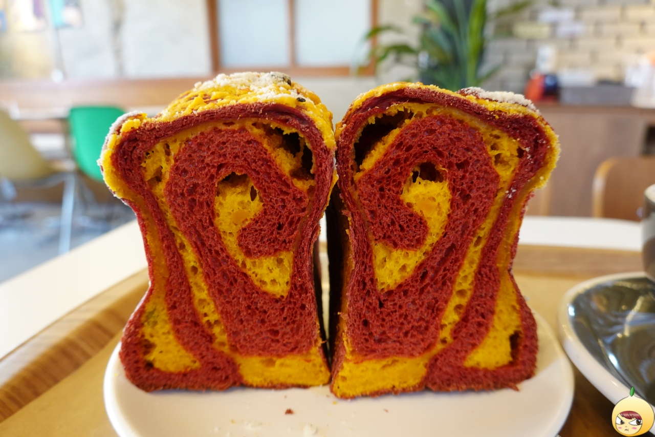 홍국쌀로 만든 홍국단호박쌀빵(5,800원)이니 홍국쌀로 빚은 술이랑 먹으면 딱 좋겠다 싶다. 하지만 술대신 커피다. 쓴커피 한모금을 마시고, 빵을 먹는다. 어라~ 이거 빵이 맞나? 모양새는 빵이 확실한데, 질감은 떡으로 찰기가 어마어마하다. 이래서 베스트1이라고 했나 보다. 단호박쌀떡이라고 해도 믿을 정도로, 빵인데 떡이다.