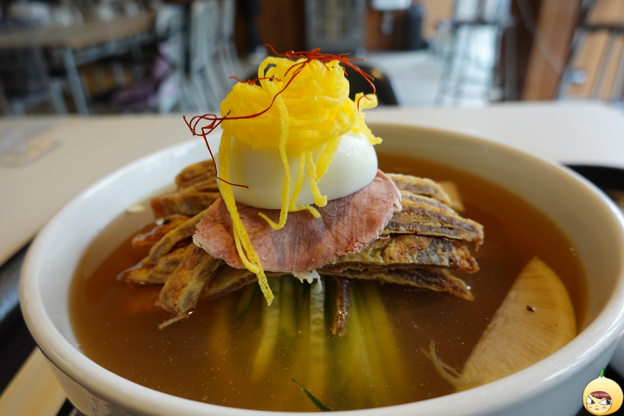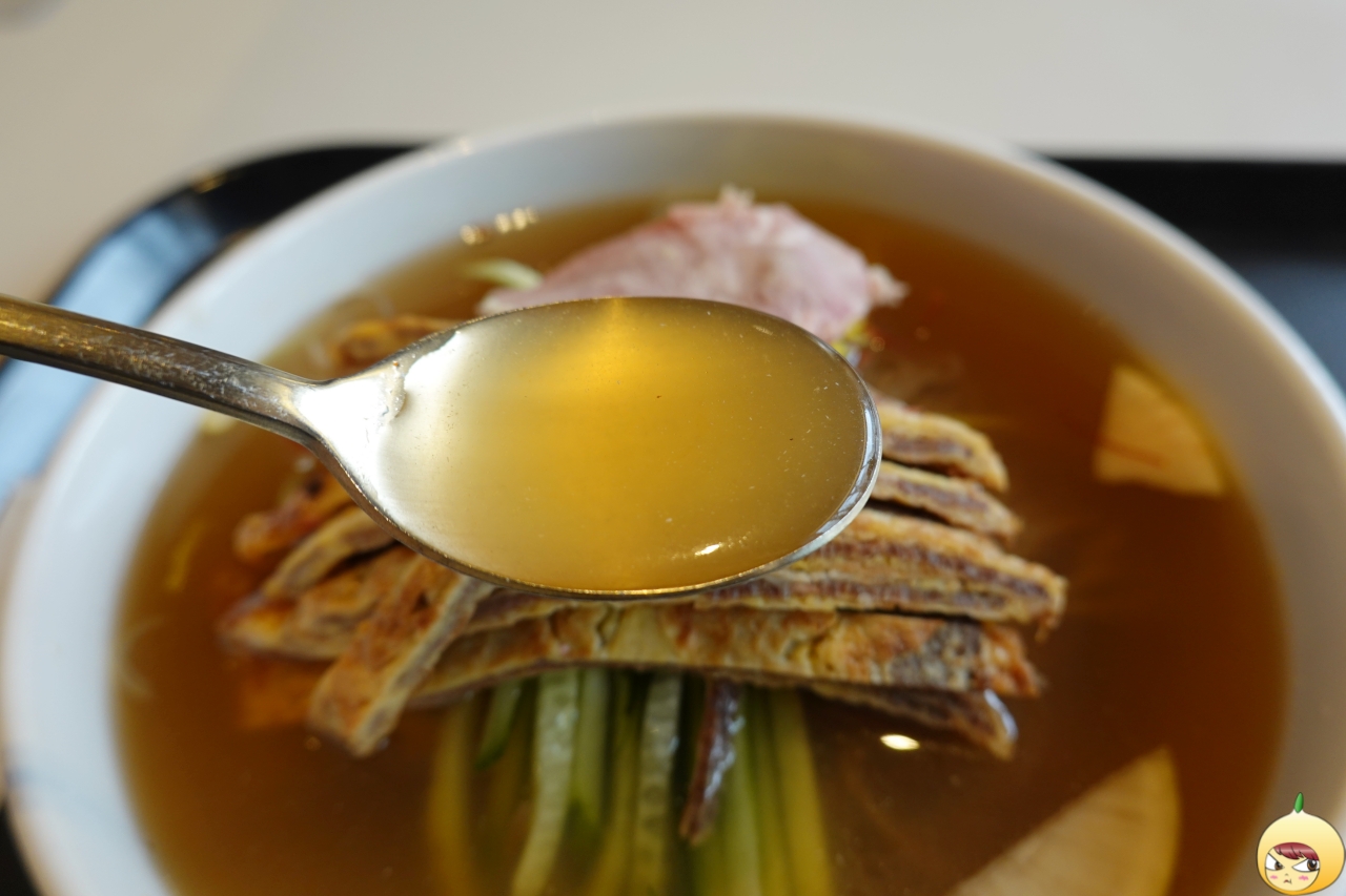 진주냉면의 특징 두번째는 육수다. 평양과 함흥은 사골을 이용해 육수를 만들지만, 진주냉면은 새우, 멸치, 바지락, 어육간장 등으로 해물육수를 내고, 여기에 소고기 육수를 더해 보름동안 저온숙성을 한다. 육수는 평양과 함흥과는 확연히 다르다. 어육간장이 더해진 해물육수이니 감칠맛 하나는 끝내준다. 그때나 지금이나 간은 여전히 강하다. 면을 풀면 조금은 나아지지만, 그래도 여전히 간간하다.