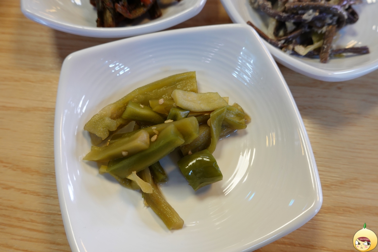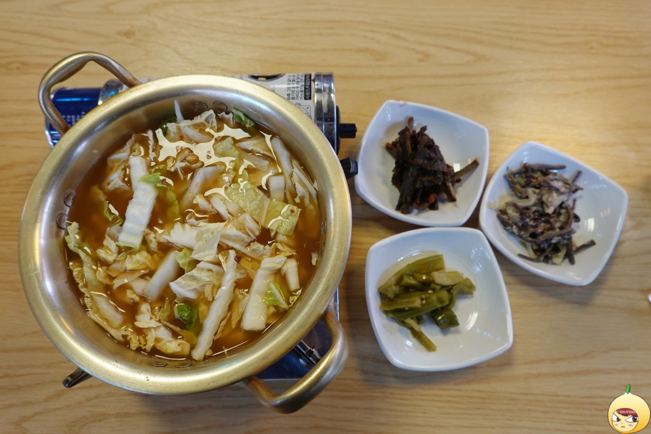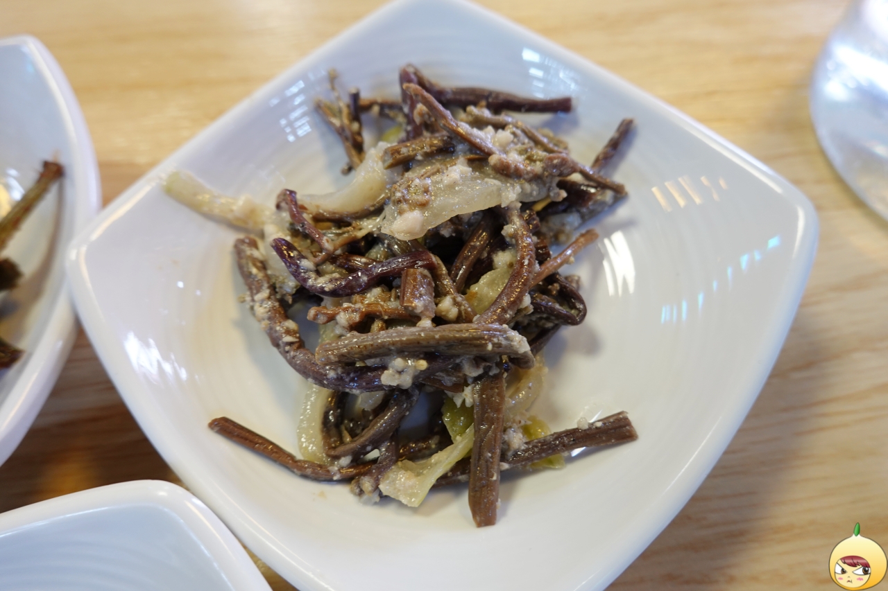 지난번에는 시원한 콩나물국이었는데, 이번에는 달달한 배추를 넣은 슴슴한 된장국이다. 가스버너가 같이 나왔다는 건, 끓여서 먹어야 한다는 의미다. 된장국 옆으로는 아삭한 상추대나물과 곰삭은 듯 겁나 잘익은 갓김치 그리고 고사리나물이다.