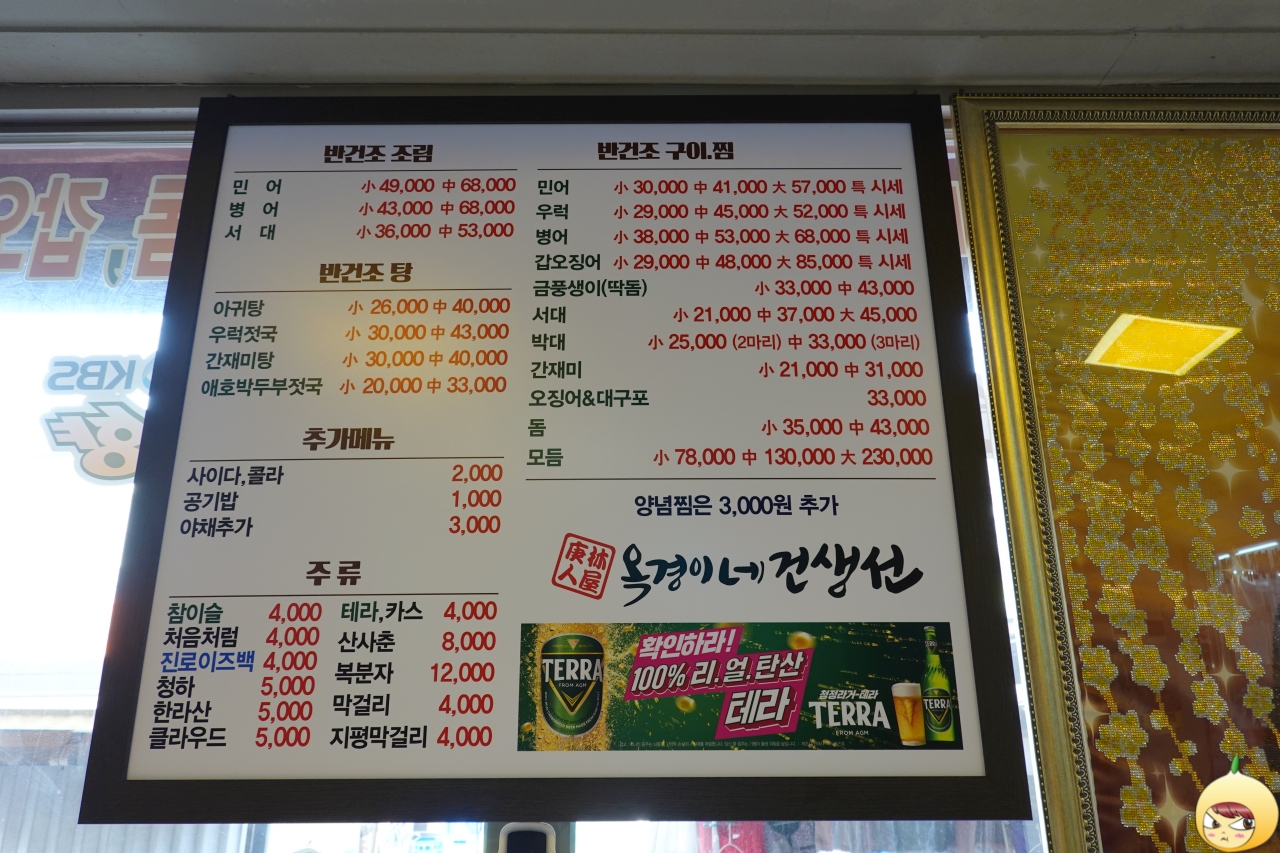 갑오징어 구이는 옥경이네건생선의 시그니처 메뉴라 할 수 있다. 이를 증명하듯 주인(?)을 기다리는 갑오징어가 겁나 많다. 대, 중, 소에서 소는 몸통 2개와 다리 하나다. 가격에 비해 양이 적다고 생각할 수 있지만, 퀄리티를 보면 바로 수긍이 된다. 참, 갑오징어 원산지는 100% 국내산이며, 주인장에게 허락은 받은 후에 촬영을 했다.