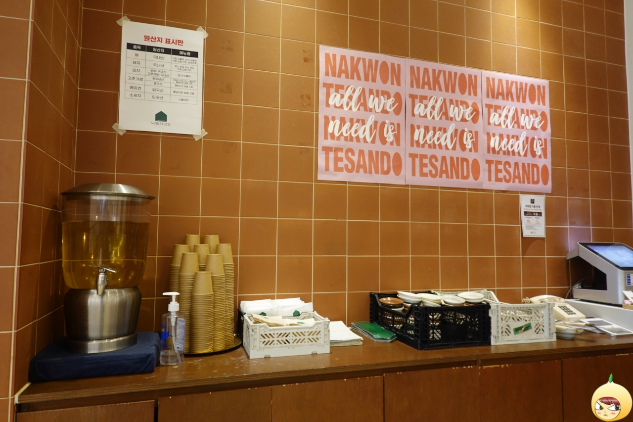 수저와 앞접시는 직원이 가져다 주고, 물과 냅킨은 직접 갖고 왔다. 이날은 텀블러를 미처 챙기지 못해서, 어쩔 수 없이 종이컵을 사용했다. 기본반찬은 무와 오이피클뿐이며, 앞접시는 혼밥이라서 사용할 일이 없다.
