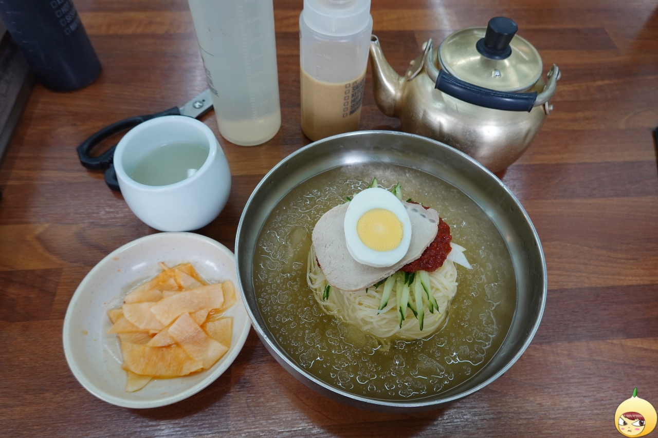 평양냉면은 양념장이 없는데, 물밀면은 막국수처럼 양념장이 들어 있다. 양념장을 보는 순간, 밀면은 물이 아니라 비빔으로 먹어야 하는데 주문을 잘못했나 싶다. 사실 주문을 하기 전에 직원에게 물과 비빔 중 추천을 해달라고 했다가, 표정이 좋지 않아서 냉큼 물밀면으로 달라고 했다. 아무래도 선택을 너무 빨리하지 않았나 싶다.