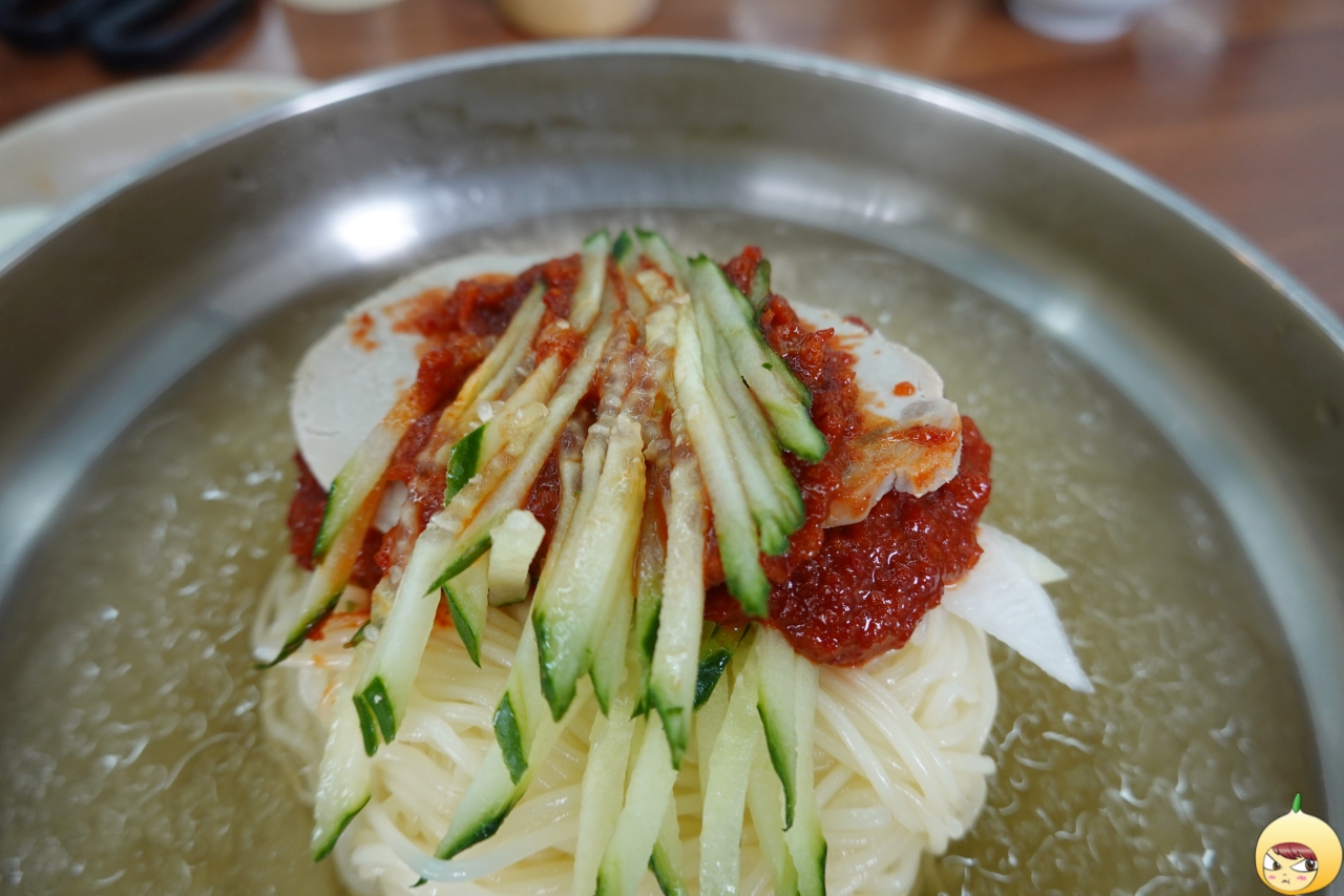 냉면보다는 막국수 느낌에 다 가깝다고 해야 할까? 뽀얀 면발만 다를 뿐, 비주얼은 겁나 익숙하다. 고명은 삶은계란과 삶은고기 그리고 오이채가 듬뿍 올려져 있다. 고기와 오이 사이에는 양념장이 들어있다.