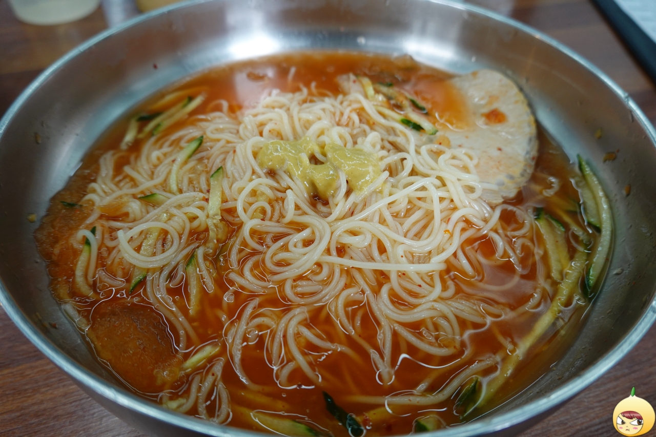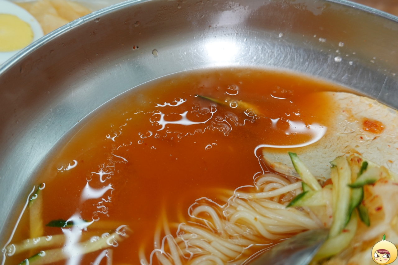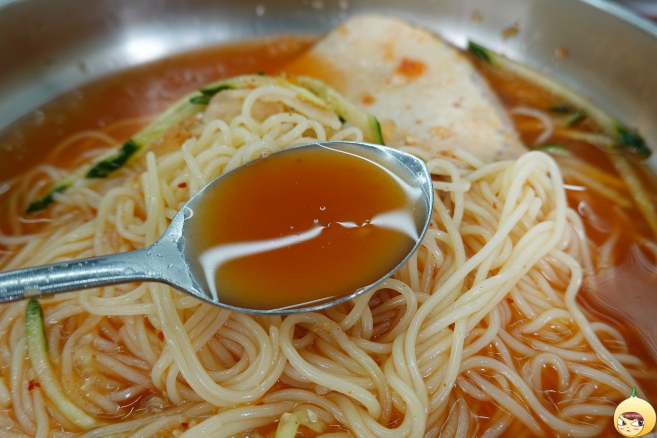 양념장을 풀기 전에는 냉면 육수같았는데, 풀고 나니 물회에 면사리를 넣은 느낌이랄까? 냉면이라고 하기에는 살짝 부족하고, 그렇다고 물회라고 하기에도 부족하고, 뭔가 어중간한 맛이다.