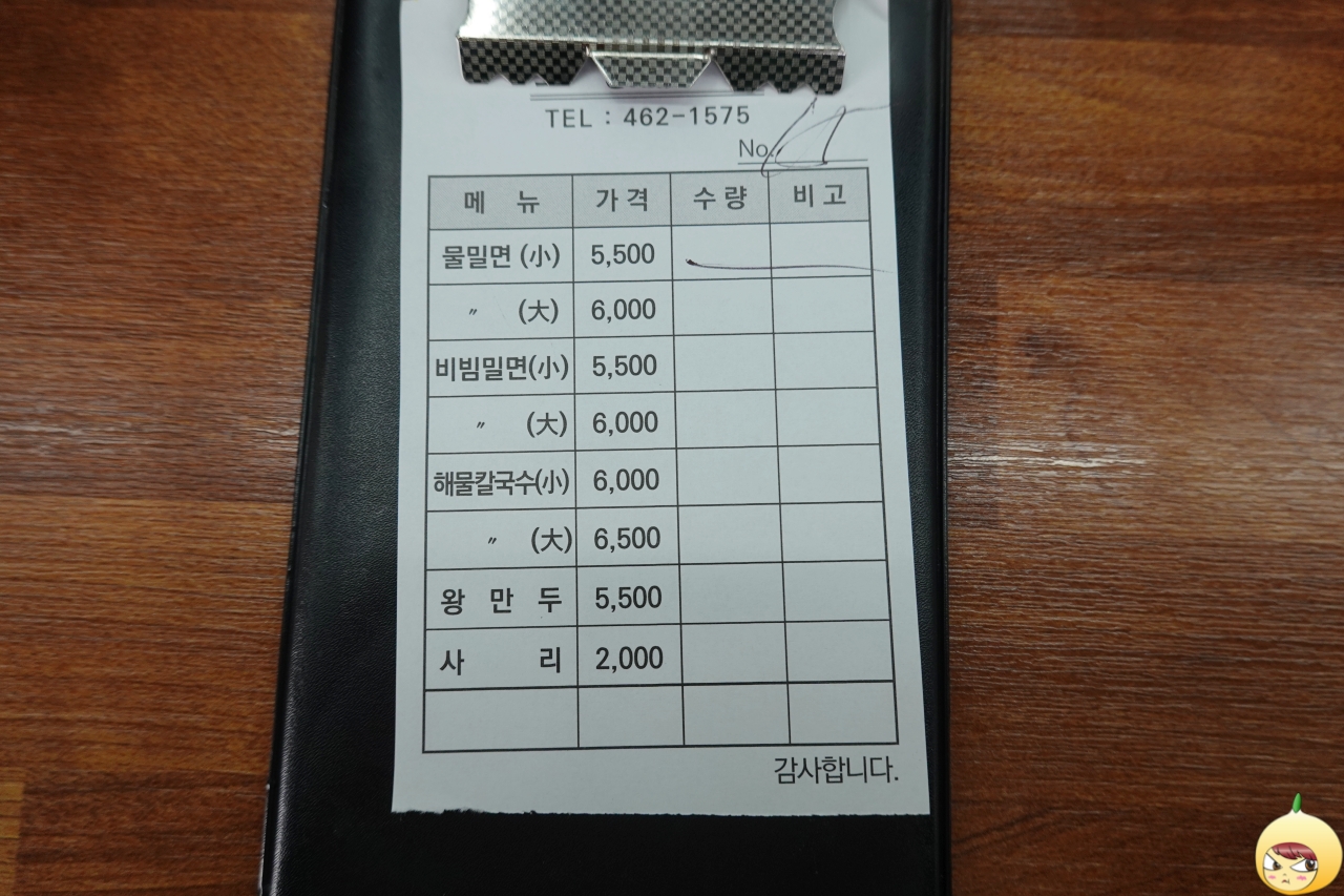 앉아 있던 곳에서 메뉴판이 너무 멀기도 하고, 사진을 찍으러 일어나기가 민망해서 주문서를 대신 찍었다. 냉면처럼 밀면도 물과 비빔이 있다. 면발이 쫄깃하니 비빔으로 먹어야 할 듯 싶은데, 시원한 육수가 끌려서 물밀면(5,500원)으로 주문했다.
