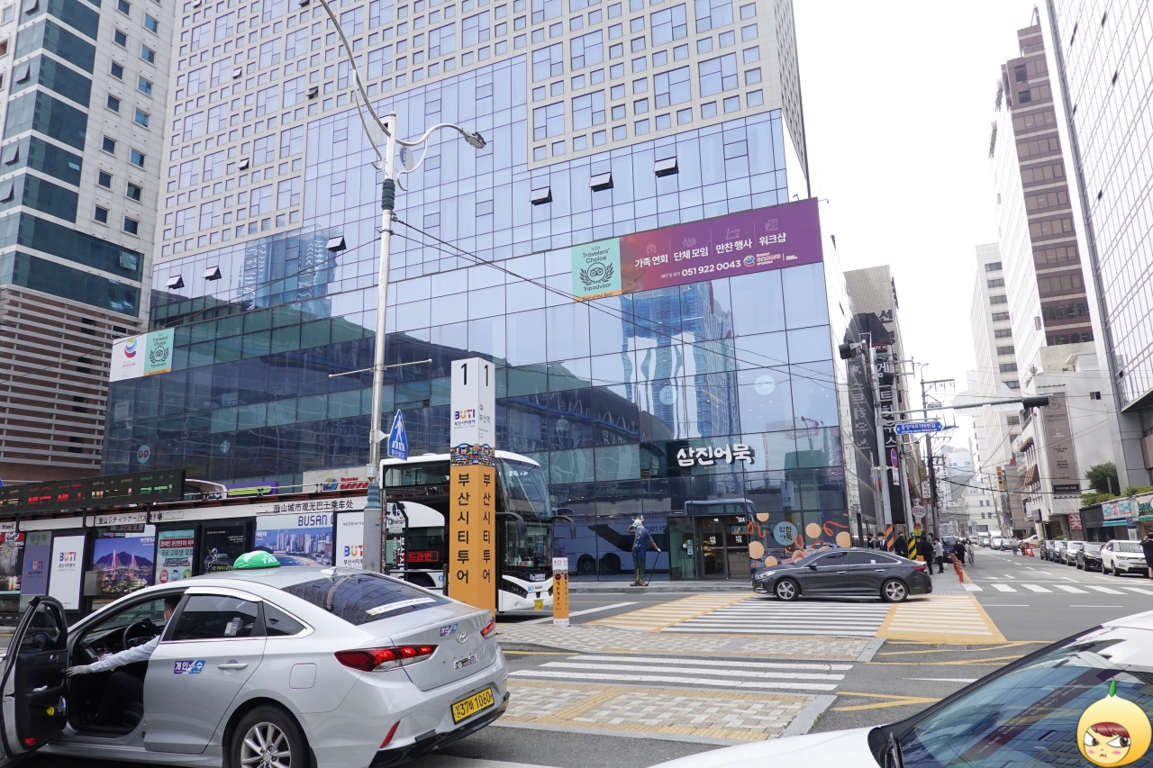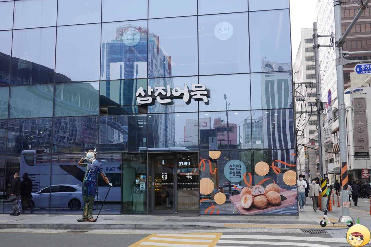 부산에 도착한 후, 숙소로 가던 중 삼진어묵 매장을 발견했다. 숙소(오름레지던스호텔)가 부산시티투어버스 정류장을 지나서 가야 한다. 건널목에서 잠시 기다리던 중, 삼진어묵 매장이 내 눈 앞에 나타나~