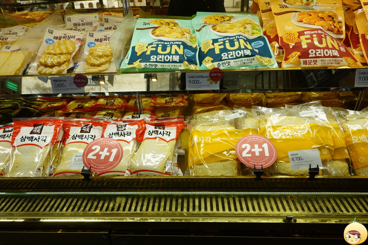 좋아하는 넙데데 어묵은 벽면 냉장고에 있다. 여기도 2+1이다. 모듬어묵에 넙데데까지 4개를 구입하고 6개를 직접 들고가지 않고 택배 주문을 하려고 했다. 그런데 유통기한이 3~4일 밖에 남지 않았다. 개봉을 하지 않고 김치냉장고에 보관하면 좀 더 두고 먹을 수 있지만, 그래도 3일은 넘 짧은 듯 싶어 하나씩만 구입하기로 했다.