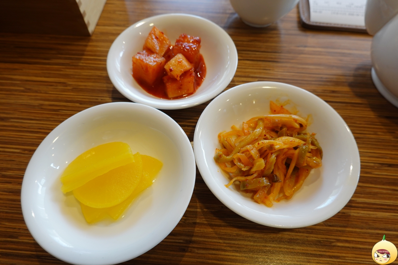 밑반찬 3총사. 노란 단무지는 무조건이고, 양파와 춘장이 아니라 노독일처는 자차이무침이 나온다. 그리고 단무지에는 없는 잘익은 빨간맛 깍두기도 있다.