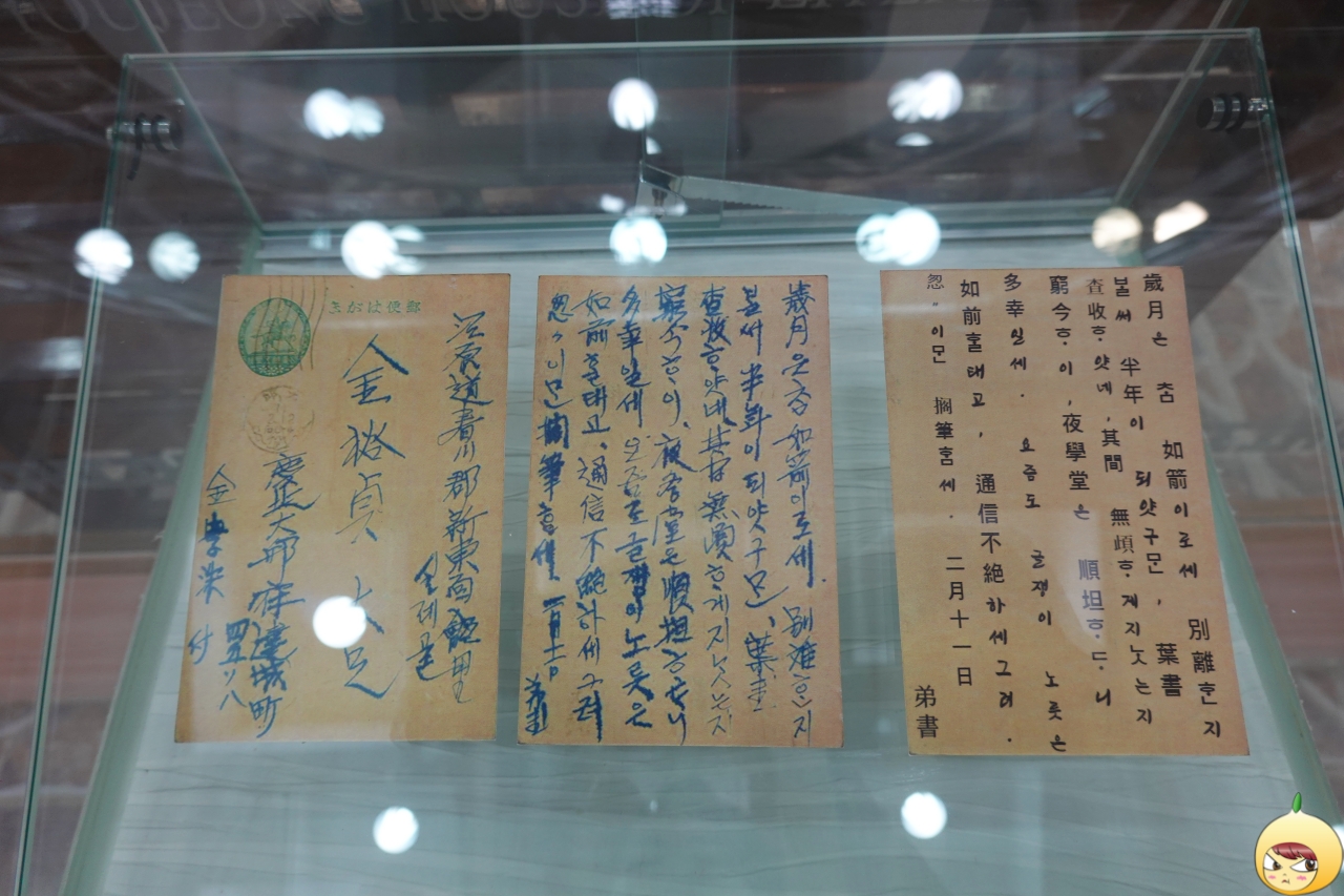 유품으로 1936년 2월 11일 대구에 사는 친구 김학수가 춘천 실레마을 김유정에게 보낸 엽서다. 원본은 아니고 복사본이다. "세월은 참 쏜살 같아 헤어진 지 벌써 반년이 되었구먼. 엽서는 잘 받았네. 그간 탈없이 지냈는지 궁금하네. 야학당은 순탄하게 진행된다니 다행일세. 요즘도 글 쓰는 일은 여전할테고, 소식이나 끊지 말고 지내세그려. 바빠서 이만 붓을 놓겠네."