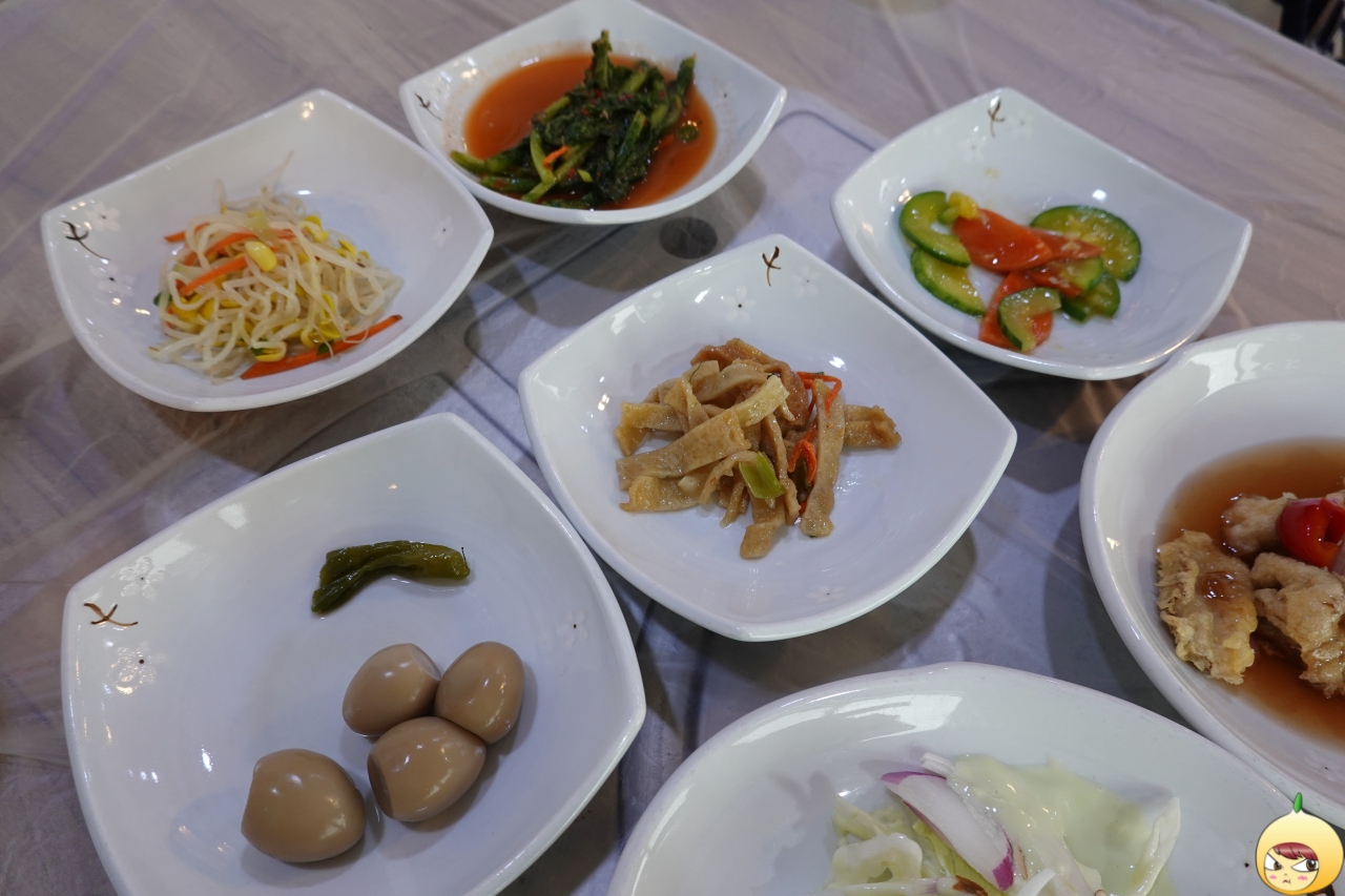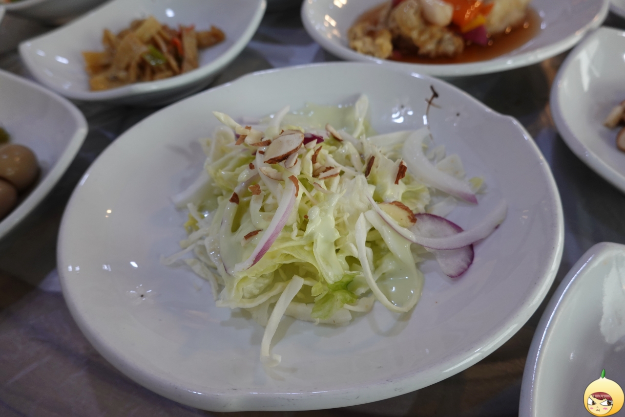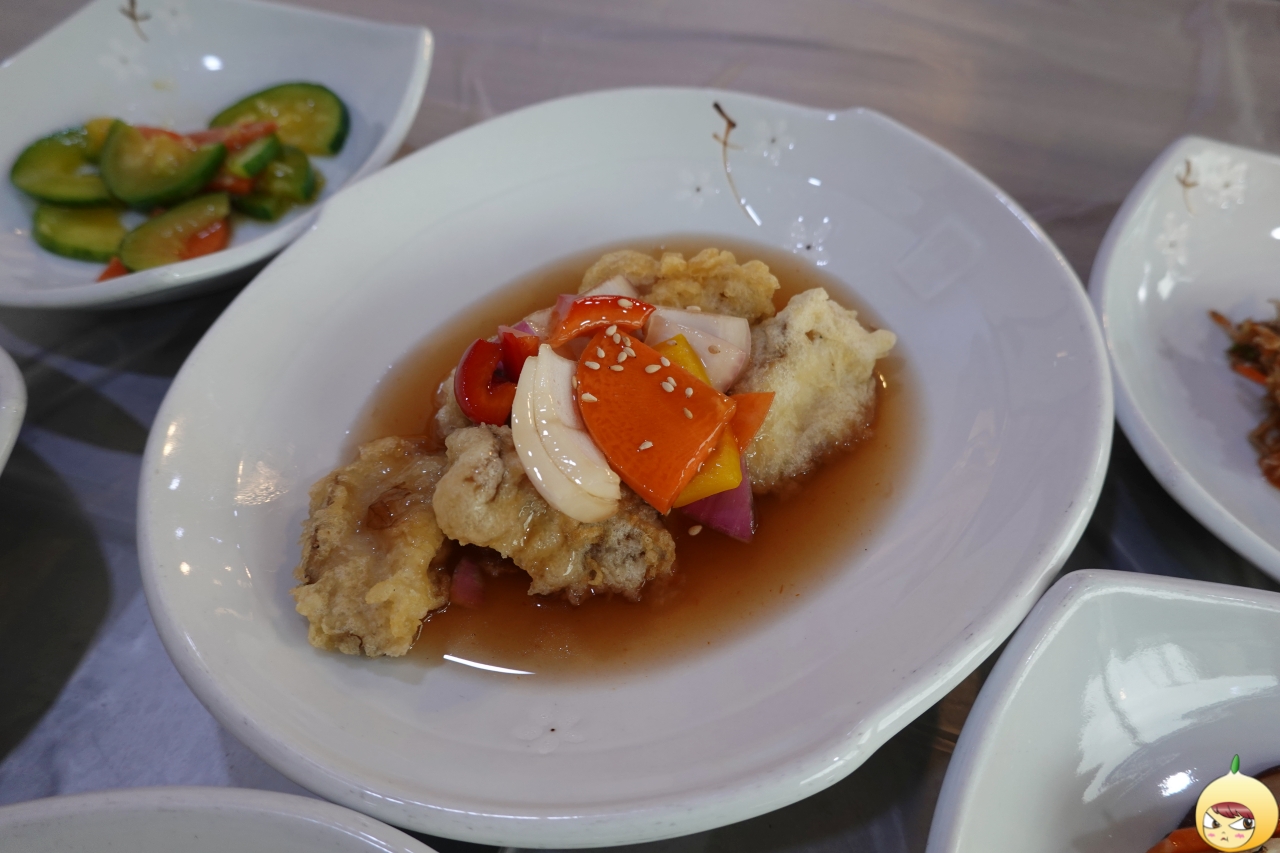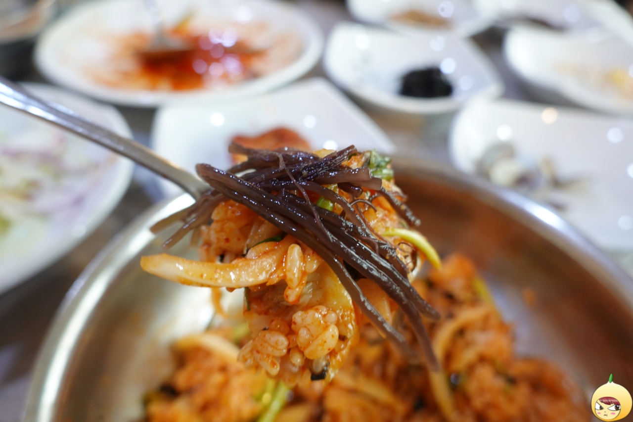 잘익은 김치는 아무래도 키조개구이랑 먹으면 좋을 듯 싶지만 그냥 먹어도 시큼하니 괜찮다. 장흥특산물답게 탕수육에 볶음까지 표고버섯 반찬이 2가지나 나왔다. 평범한 김자반과 멸치 그리고 콘샐러드를 지나 바다 맛 가득한 꼬시래기도 있다.