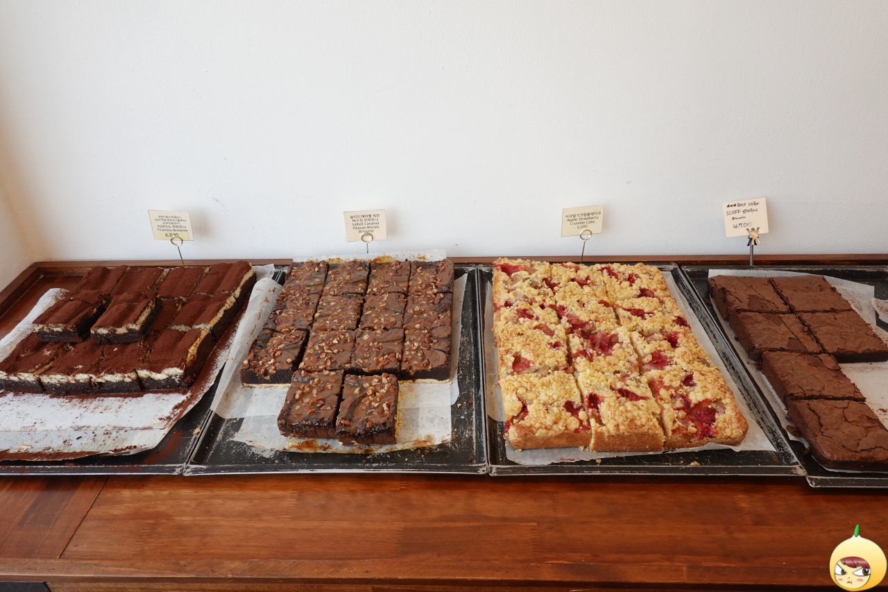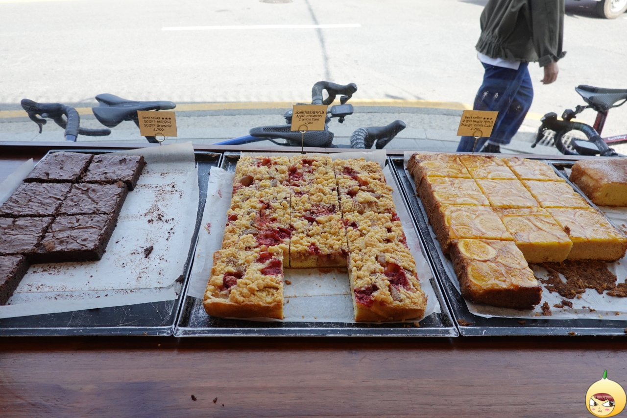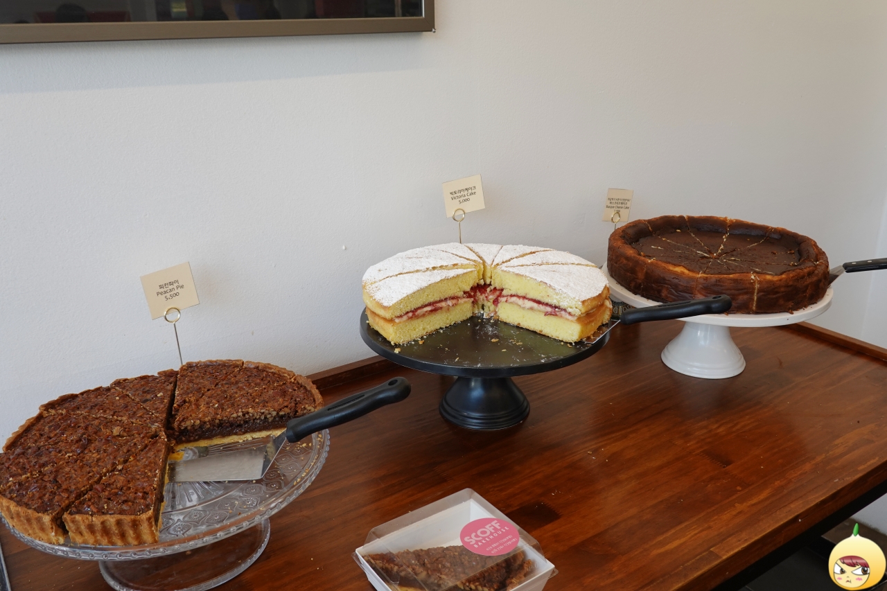 제일 먼저 베스트셀러 스코프(SCOFF) 브라우니와 사과딸기크럼블케이크 그리고 오렌지바닐라케이크다. 이제 고작 3개를 봤을 뿐인데, 전부 다 쟁반에 담고 싶다. 특히 오렌지바닐라케이크는 생김새부터 상큼달달함이 느껴진다.