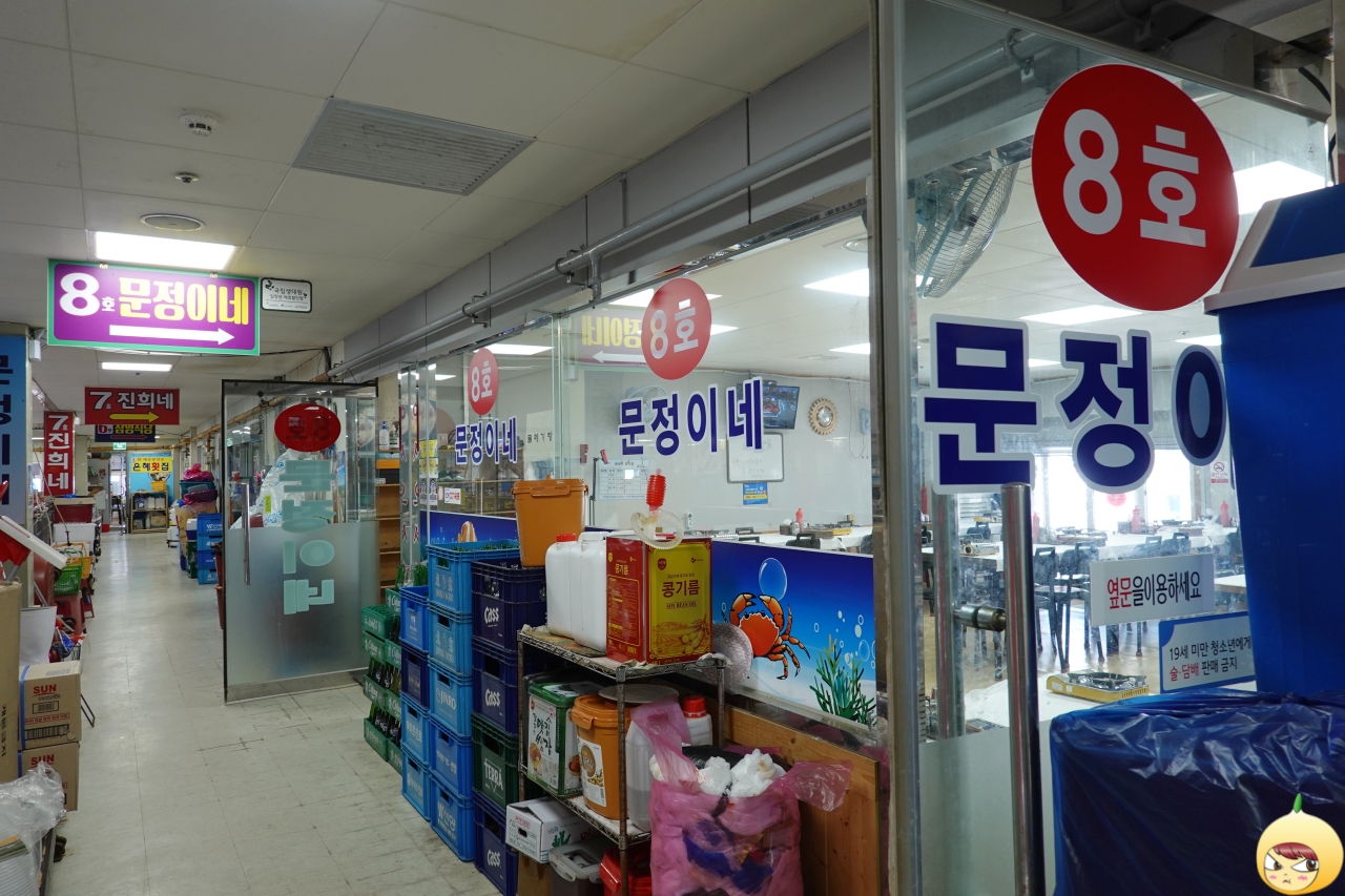 애기전복과 백합 비슷한 조개를 서비스로 받았다. 해산물을 골라서 결제를 하면 주인장이 어디에 가서 먹으면 되는지 알려준다. 노량진 수산시장처럼 서천특화시장도 1층에서 해산물을 구입한 후, 2층에 가서 먹으면 되는 시스템이다. 점포만큼 식당도 많아서 어디로 가야하나 잠시 고민을 했다. 그런데 점포와 식당이 연결되어 있는지 "2층으로 올라가서 8호 문정이네로 가면 된다"고 주인장이 자세히 알려줬다.
