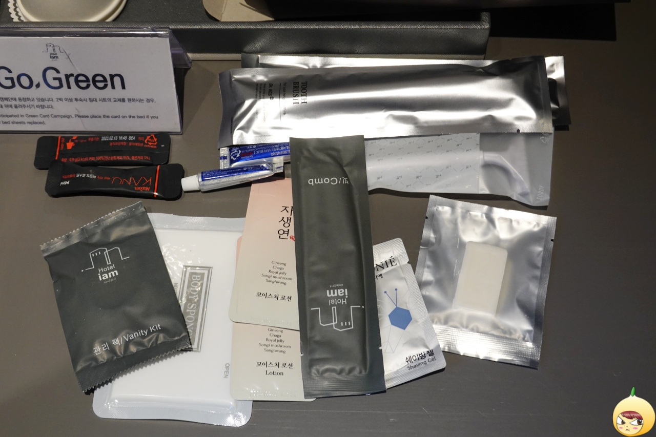 어메니티는 1회용이 대부분이라서 굳이 사용하지 않는다. 옷은 더 챙겨오지 않더라도, 세면도구는 빠트리지 않고 다 챙겨 다닌다. 그래서 1박이라도 캐리어를 포기할 수 없다. 촬영을 위해 꺼내 놓은 후, 다시 박스에 담았다.