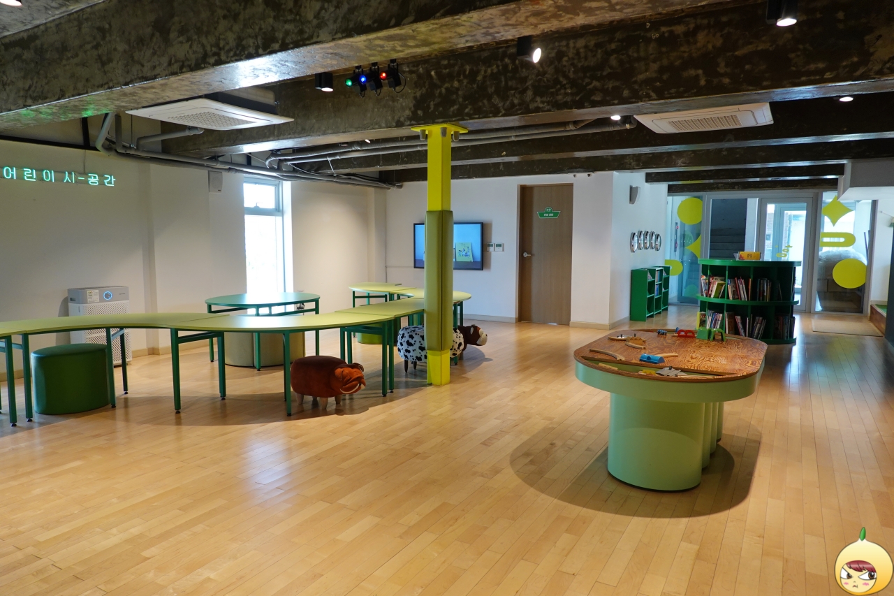 맞이홀 옆에는 아이들이 잼나게 놀 수 있는 어린이라운지가 있다. 책을 읽을 수 있고, 그림 도구가 갖춰서 있어 그림도 그릴 수 있다. 아이들을 위한 공간도 있는데, 어른들을 위한 공간도 있을까? 있다. 2층으로 올라가면 나온다.