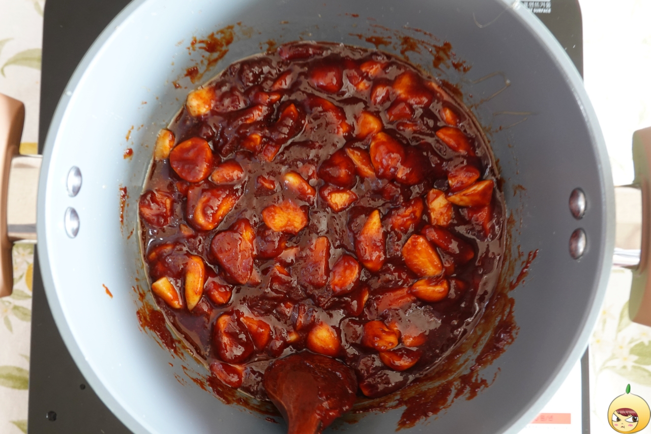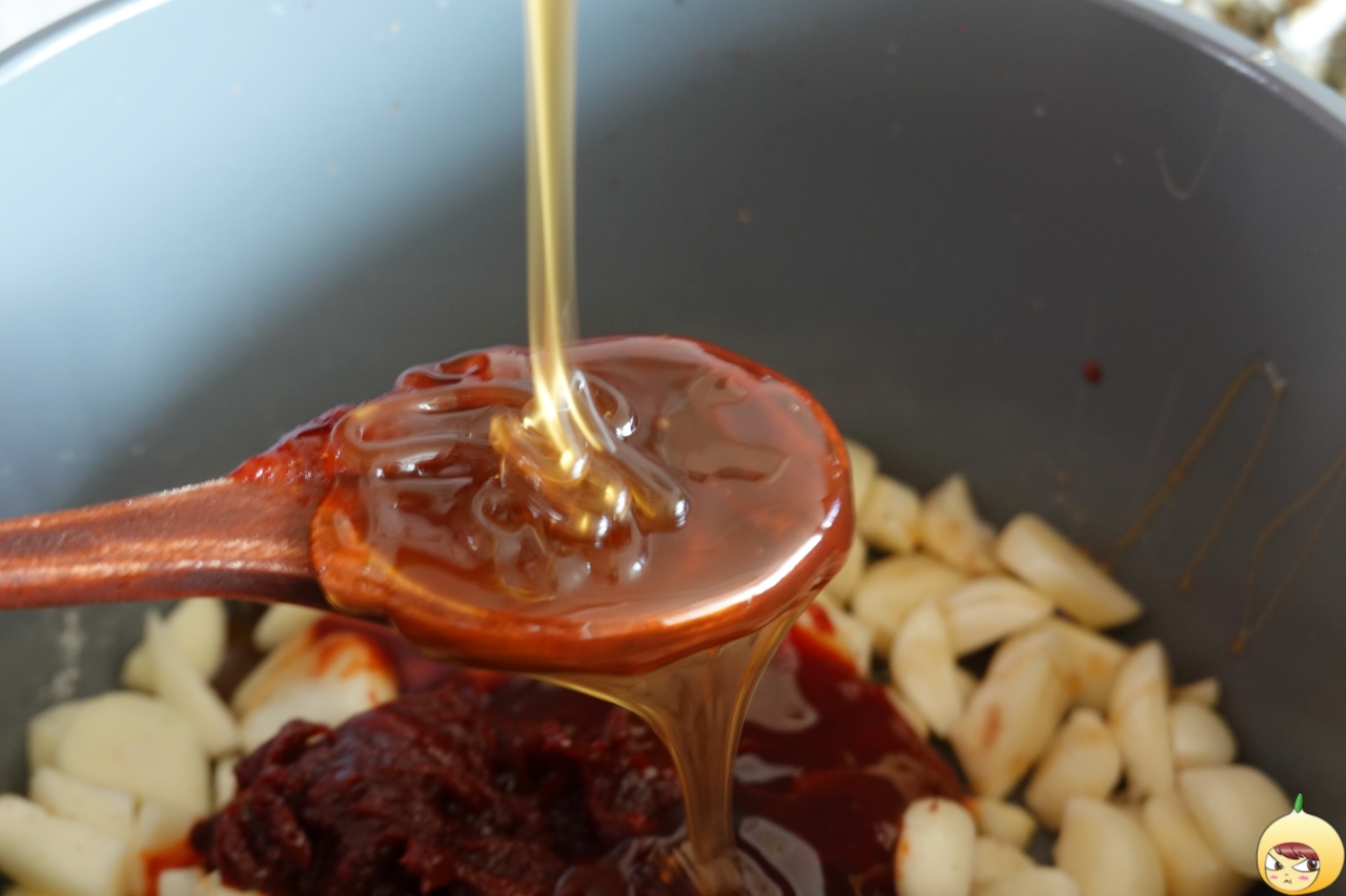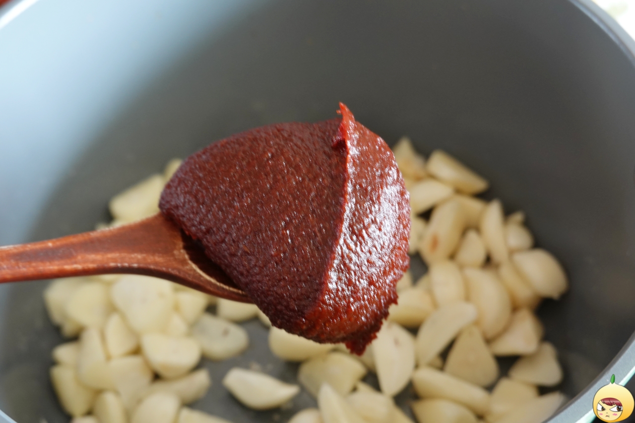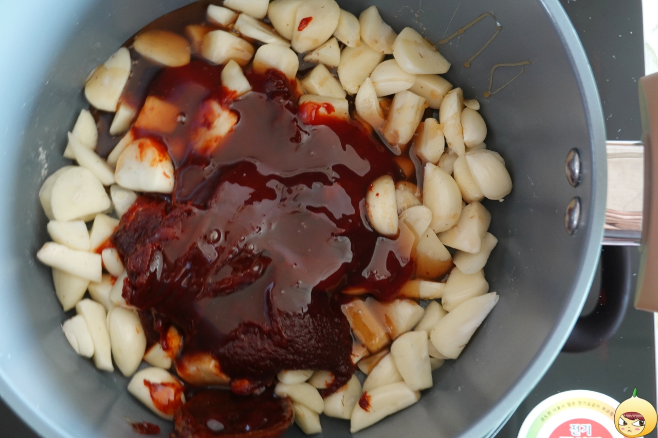 고추장은 5큰술을 넣으면 된다. 예산 찹쌀고추장은 매운맛이 약해서, 집에 있는 매운 고추장도 함께 넣었다. 고추장 때깔이 다른 이유는 다른 고추장이기 때문이다.