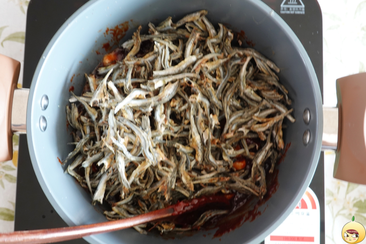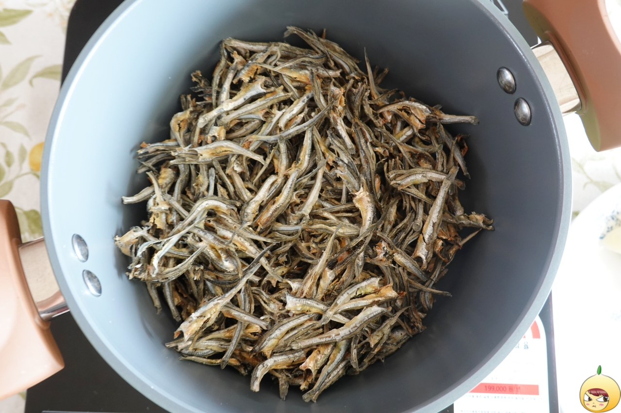 기름을 두르지 않은 냄비(원래는 웍이나 후라이팬이 좋은데 인덕션용은 이거 하나 뿐이라서)에 대가리와 똥을 제거한 멸치를 넣고 볶아준다. 이렇게 하는 이유는 멸치의 잡내를 날리기 위해서다.