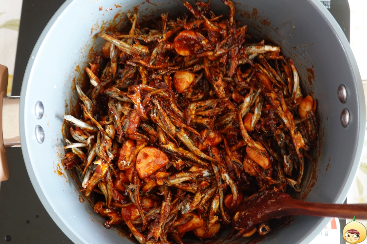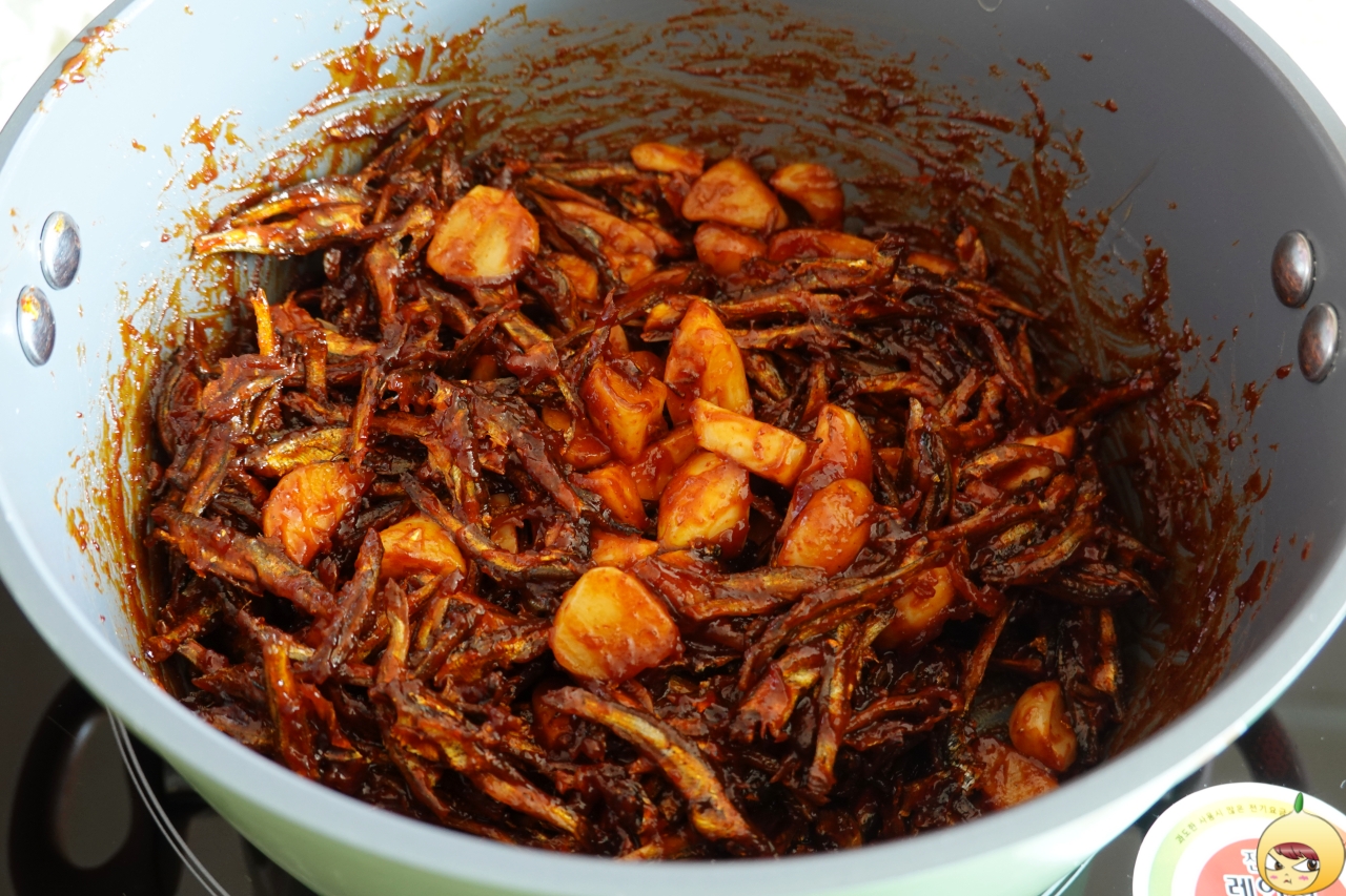 모든 양념을 다 넣고, 아까 볶았던 멸치도 다시 넣고 양념이 잘 섞이도록 볶으면 된다. 고추장을 많이 넣었는데도, 마늘 특유의 알싸한 향이 올라온다. 생마늘은 매워서 못 먹었지만, 이렇게 볶은 마늘은 매운맛은 덜하고 풍미는 더해진다.