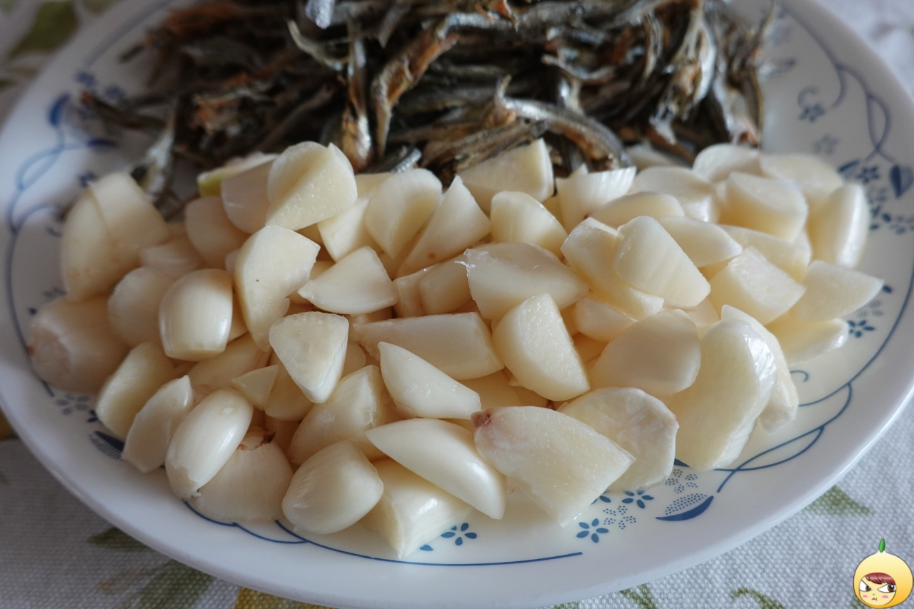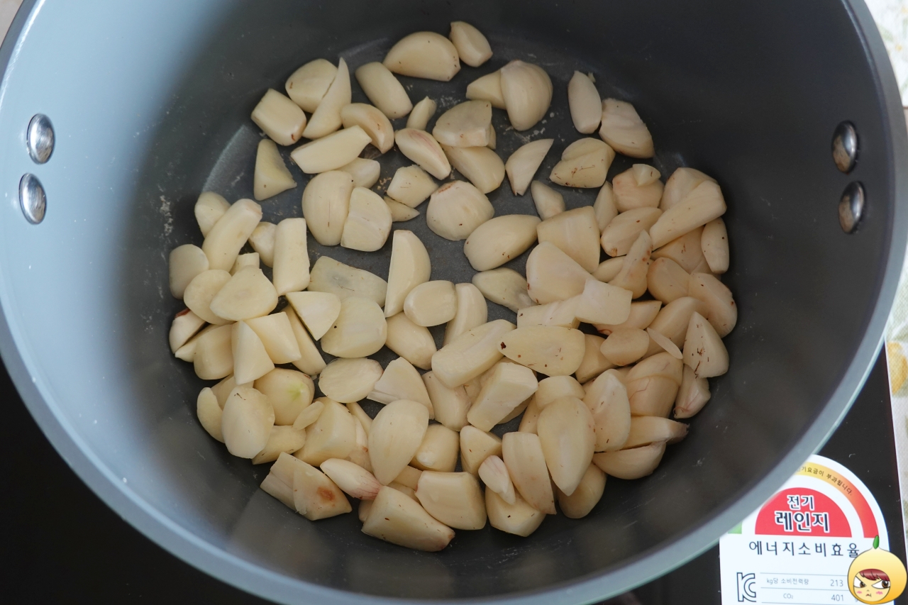 멸치가 어느 정도 볶아졌다면, 덜어내고 마늘을 볶는다. 참, 마늘은 통이 아니고, 아무렇게 대충 썰어도 된다. 단, 너무 얇게 보다는 식감을 살려야 하니 굵기가 있어야 한다. 역시나 기름은 두르지 않는다. 이 작업은 안해도 되는데, 마늘이 주인공이라서 단독샷을 위한 연출이다.