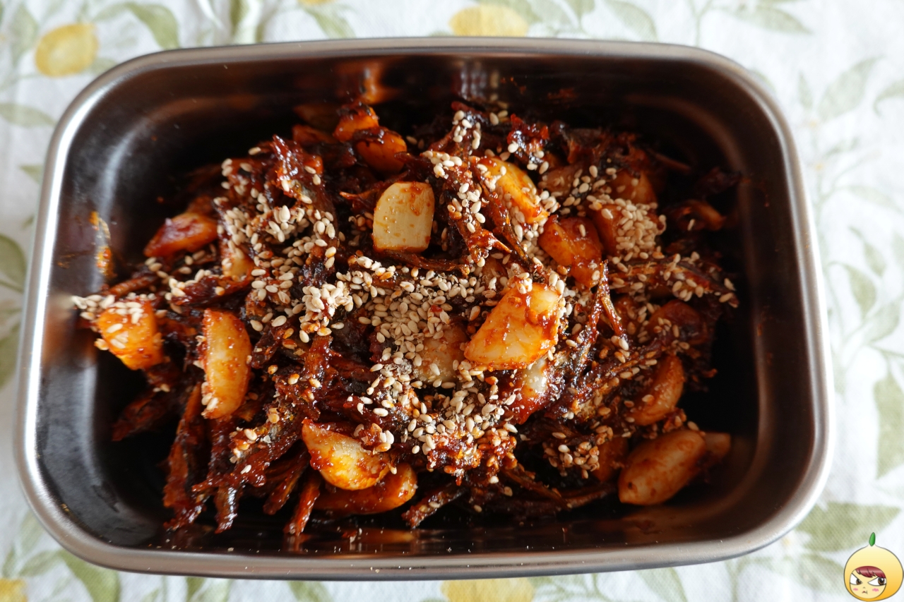반찬통에 먹기 좋게 담고, 마무리로 꺠소금을 뿌린다. 잔멸치로는 과자처럼 바삭하고 달달한 멸치볶음을 만들고, 중멸치는 이렇게 고추장을 넣어서 맵게 만든다. 물엿으로 인해 식으면 멸치는 바삭해지고, 마늘은 아삭한 식감과 함께 단맛이 올라온다.
