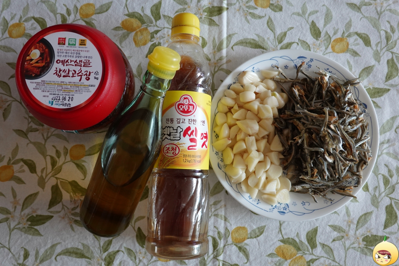 원래는 멸치가 주인공이지만, 이번에는 마늘이 주인공이다. 고로 재료 소개도 마늘이 먼저다. 사진은 마늘과 멸치가 1:1처럼 보이지만, 자리가 좁아서 멸치를 덜 올렸다. 양념은 지난 주 떡볶이 편에서 등장한 예산 찹쌀고추장과 들기름 그리고 물엿이다. 여기에 참치액과 깨소금도 살짝 들어간다. 참, 마늘 몇개, 멸치 몇그램은 모른다. 엄마표 레시피는 계량따위는 필요치 않으니깐.