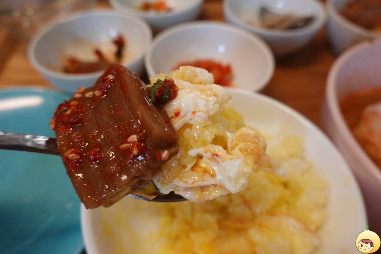 자고로 계란밥에는 버터나 마가린은 선택이지만 간장은 필수다. 따로 요청을 할까 하다가, 도토리묵을 리필해서 양념간장만 따로 넣고 비볐다. 흰쌀밥으로 시작했지만, 지금은 간장계란밥에 육개장국밥으로 다양하게 먹고 있다. 뻑뻑했다가 촉촉했다가 왔다갔다 하면서 먹는 재미가 있다.