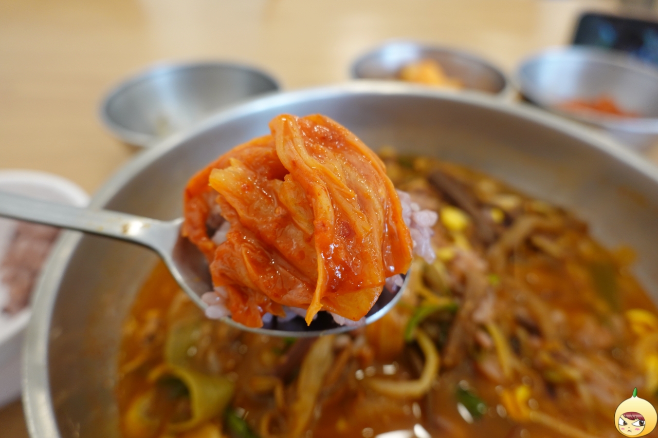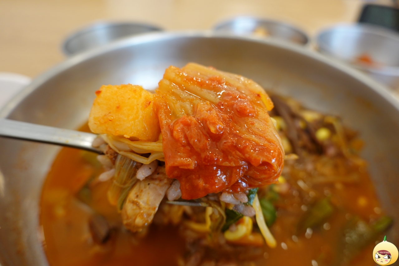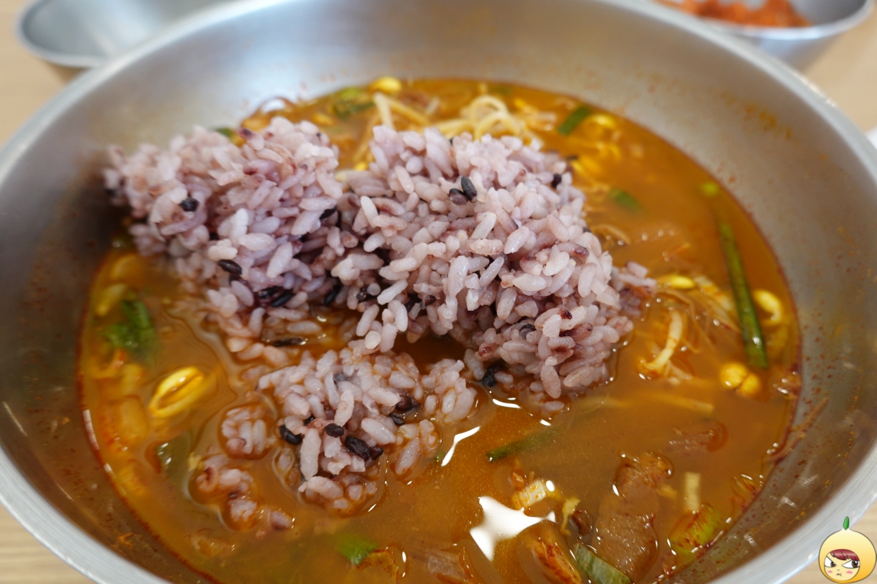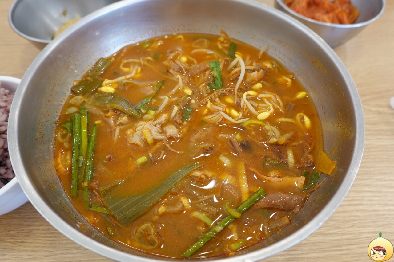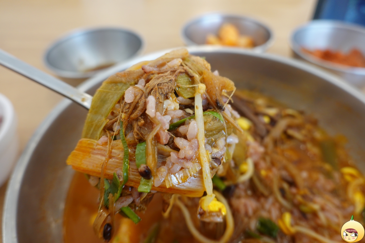 국물 한숟갈에 녹색이를 소환하고 싶지만, 더운 여름에 알콜은 피해야 한다. 왜냐하면 더위를 잘 타는 체질에 알콜을 더하면 불난 집에 부채질하는 꼴이기 때문이다. 안주가 아닌 식사에 집중하고 싶어 바로 밥을 투하했다. 고기가 없어서 여전히 아쉽지만, 고사리와 토란대가 푸짐해서 괜찮다.