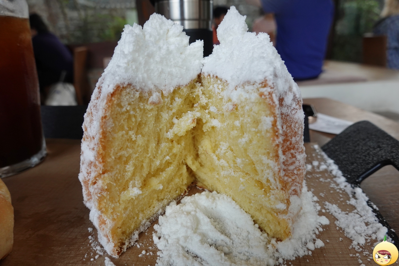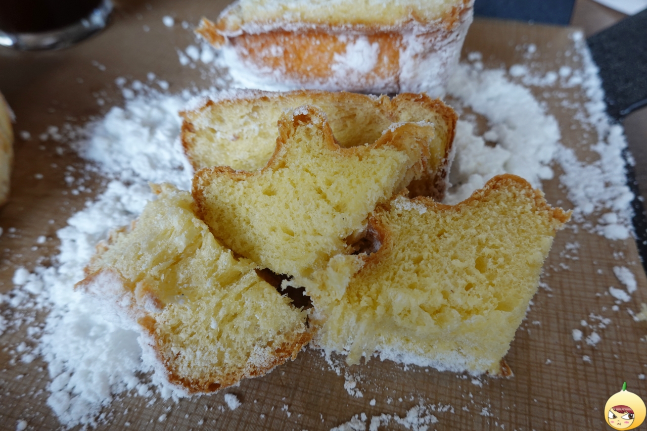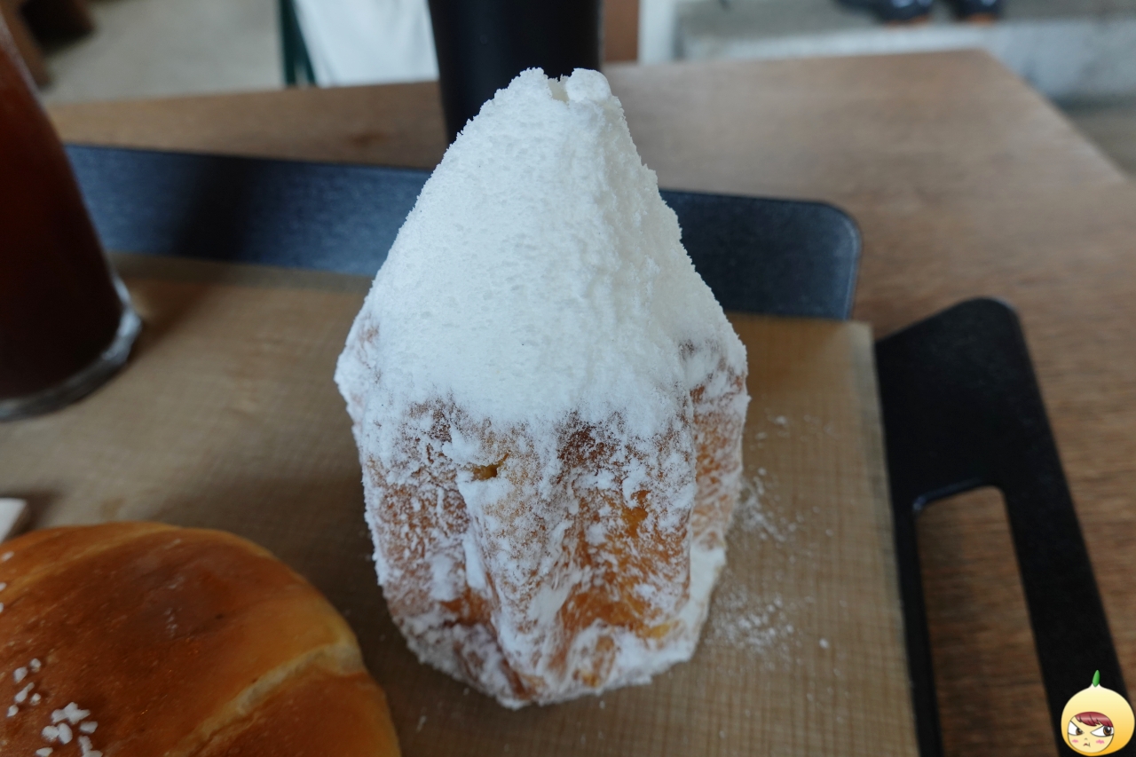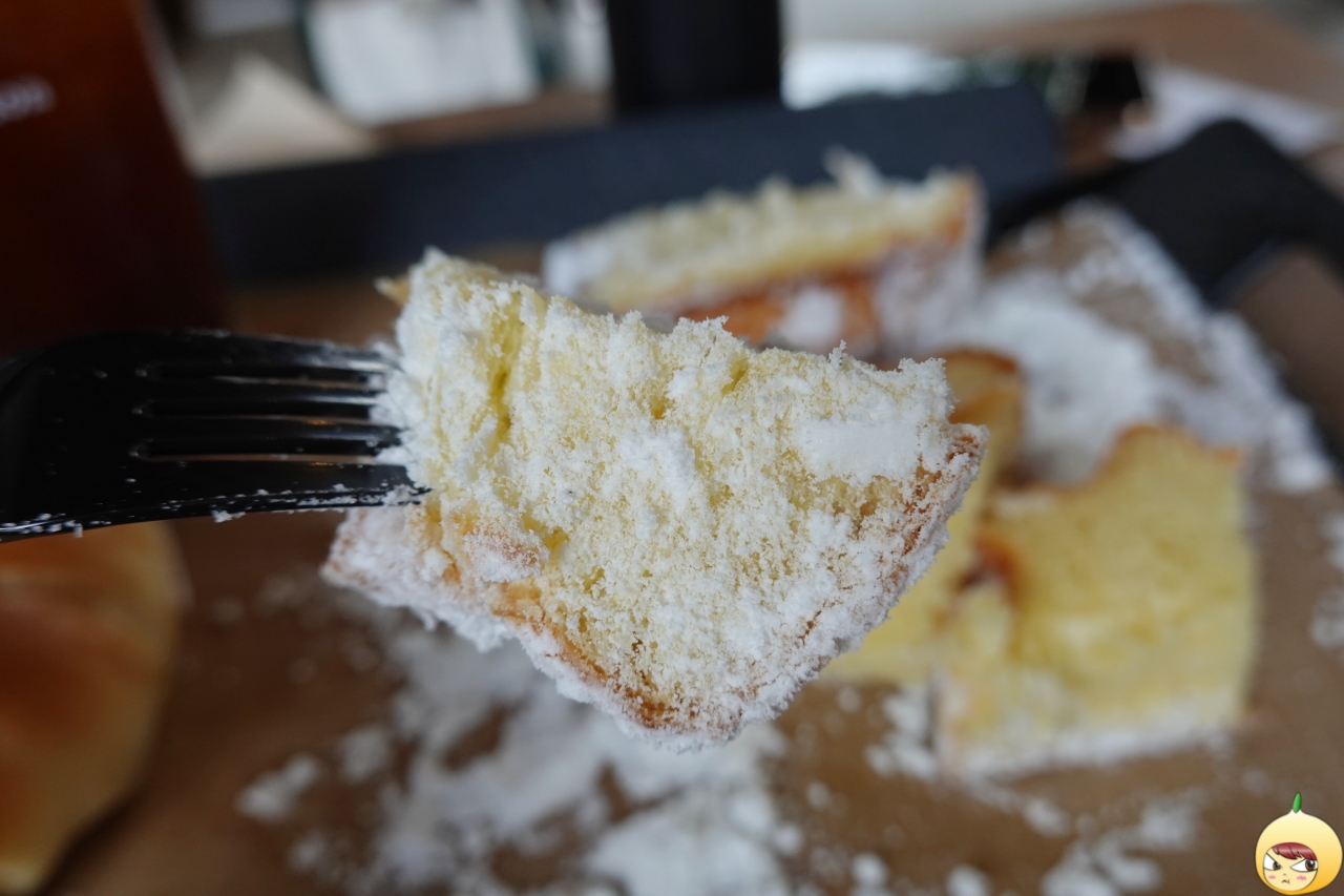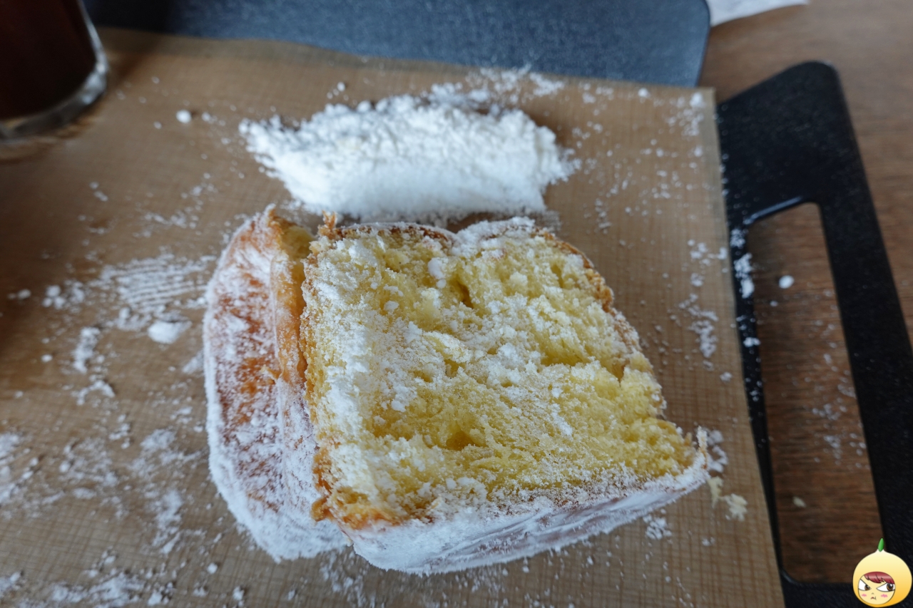 어떻게 먹어야 하는지 몰라서, 직원에게 물어봤다. 자르면 슈가파우더가 흐르는데 상관하지 말고, 빵에 슈가파우더를 찍어서 먹으면 된다. 공든 탑을 무너뜨리기 싫었지만, 먹으려면 어쩔 수가 없다. 가루날림이 심하니 조심해서 칼질은 해야 한다.