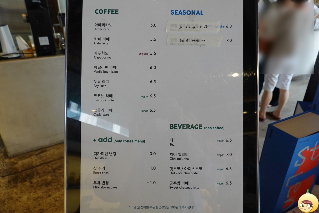 메뉴판에 나와있는 +add 항목을 지금 봤다. 디카페인 변경은 0원이란다. 이걸 이제야 보다니, 한심하고 어리석다. 참, 텀블러 할인은 따로 없다.