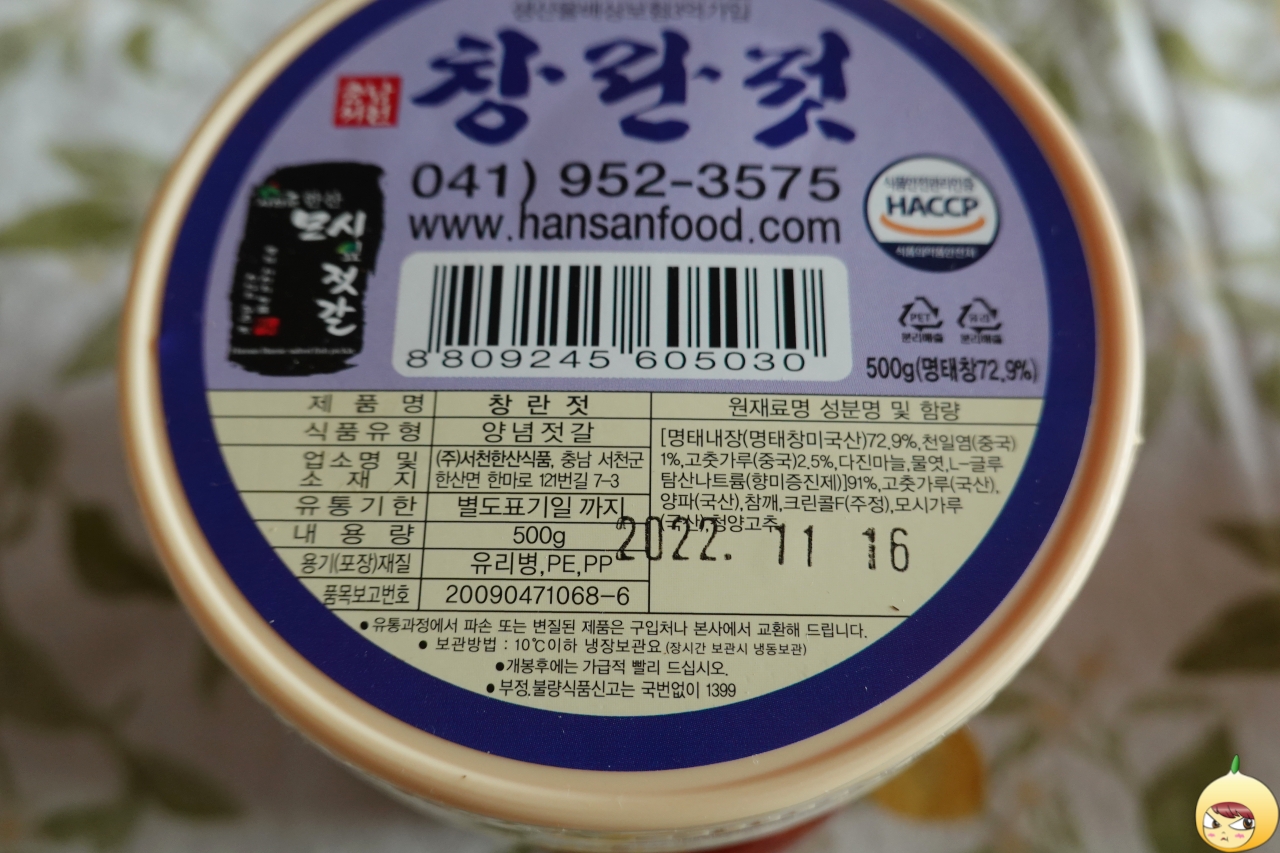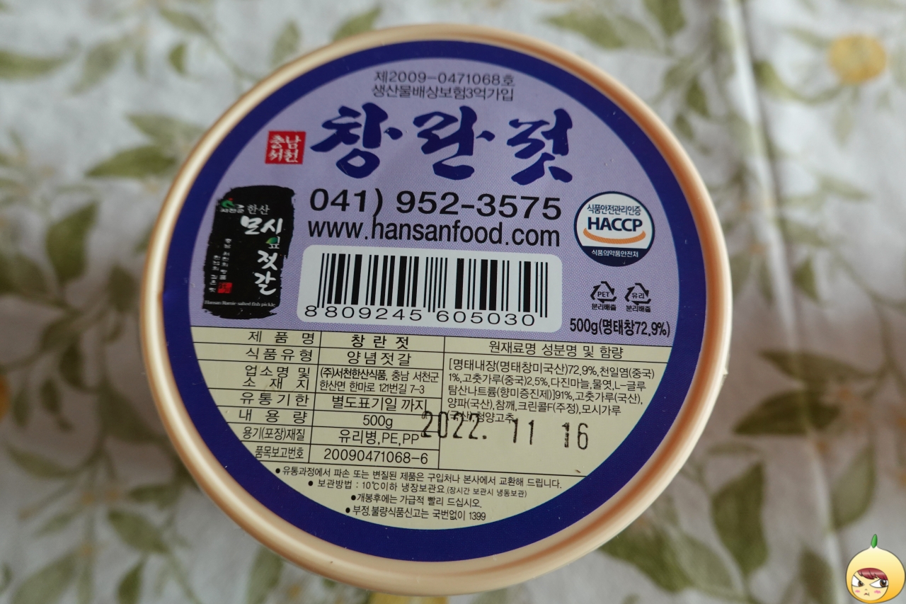 창란젓은 엄선된 명태의 창자로 만든 양념젓갈로, 꼬들꼬들한 식감이 매력적이다. 용량은 500g이고, 원재료명과 성분, 함량은 물론 유통기한까지 잘 표기되어 있다. 2022년 11월 16일까지로 나와있지만, 짧으면 한달 길어야 두달이다.