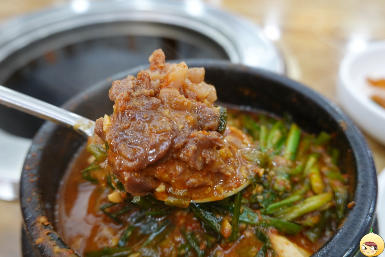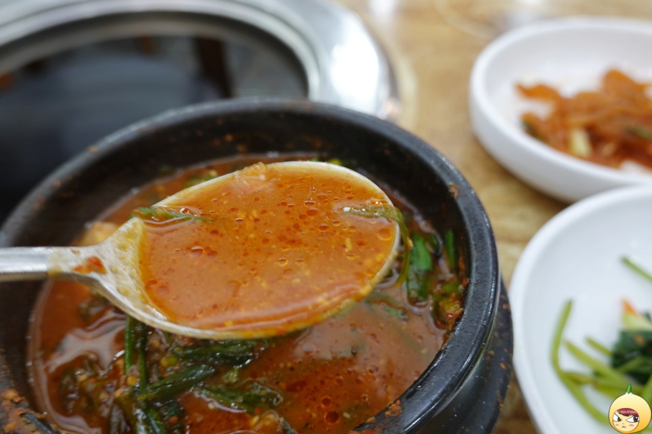 아직은 특별한 된장찌개인지 모르겠다. 부추가 좀 많아 보이고, 국물은 진해 보이지만, 특별함은 찾지 못하겠다. 하지만 잠시 후 숟가락으로 된장찌개를 파헤치는 순간, 왜 특별한지 알게 된다.