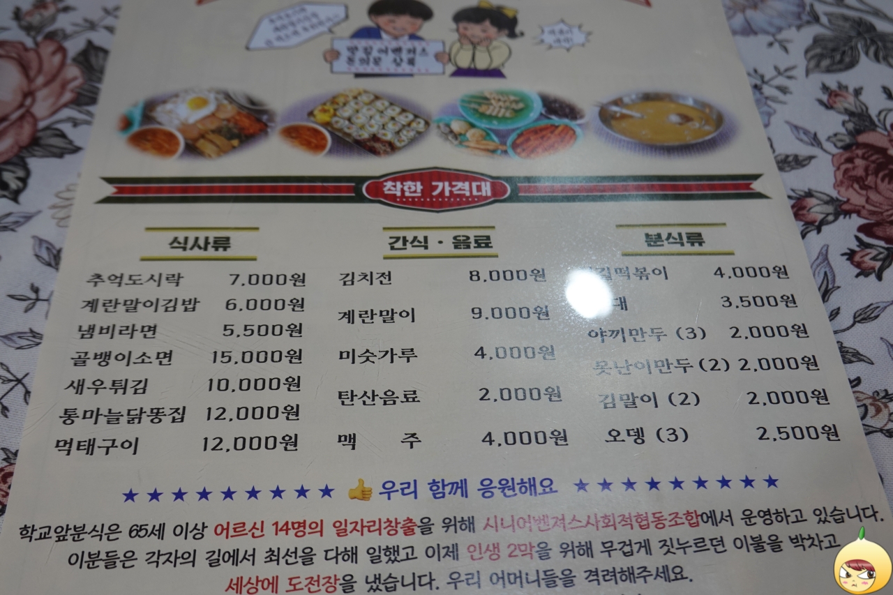 참, 학교앞분식은 어르신 일자리 창출을 위해 시니어벤져스사회적협동조합에서 운영을 하고 있다고 한다. 그래서 음식이나 서빙이 더딜 수 있다.