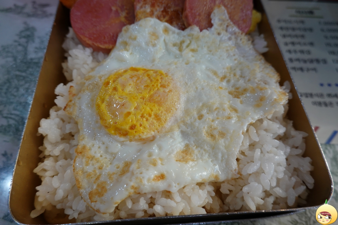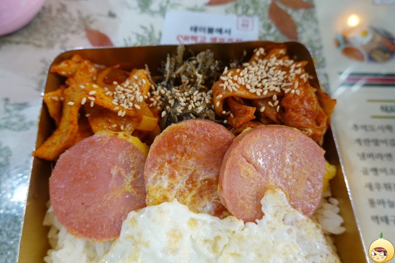 따끈한 밥 위에는 반숙 계란후라이가 올려져 있다. 반찬은 계란 옷을 입은 분홍소시지와 볶음김치, 멸치볶음 그리고 어묵볶음이다. 특별한 것도 없고, 누구나 다 아는 그 맛이다. 그런데 양은도시락이라는 용기를 만나면, 맛이 달라진다. 좀 더 예스럽고 정다운 맛이랄까?
