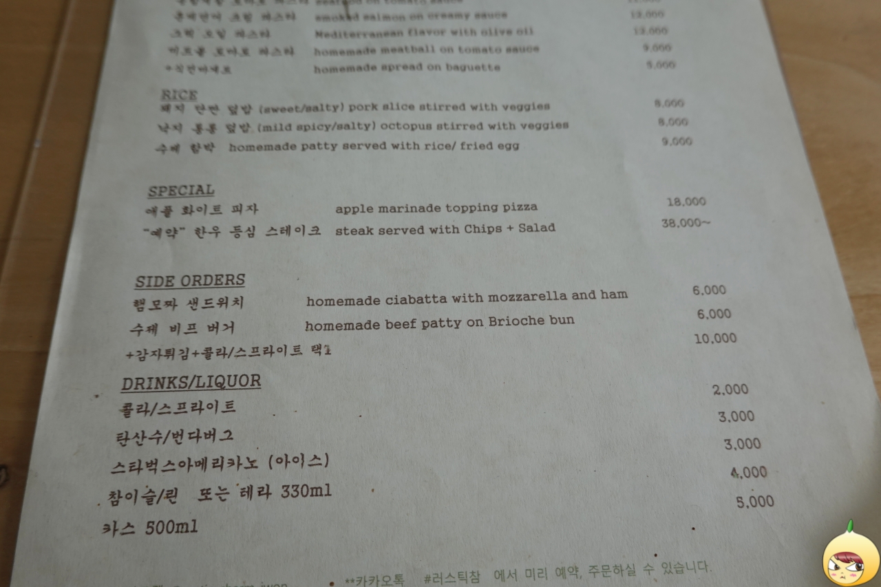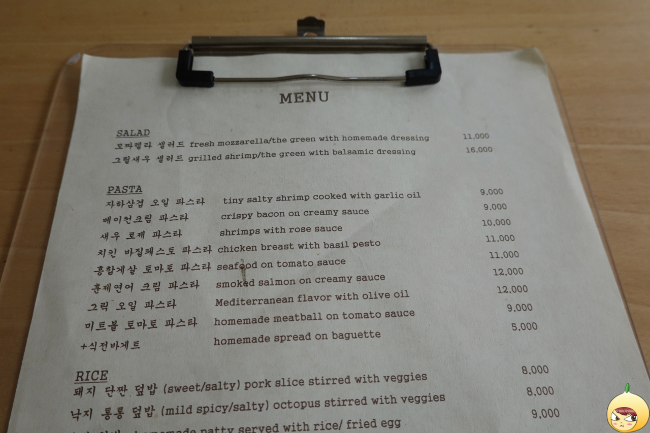 혹시나 싶어 어죽과 도리뱅뱅이가 있을까 메뉴판을 주의깊게 봤지만, 당연히 없다. 메인은 파스타인 듯 싶고, 덮밥, 함박, 스테이크, 수제버거까지 종류가 은근 많다. 처음 왔으니 주인장에게 메뉴추천을 부탁했고, 그는 치킨 바질페스토 파스트(11,000원)를 추천했다.