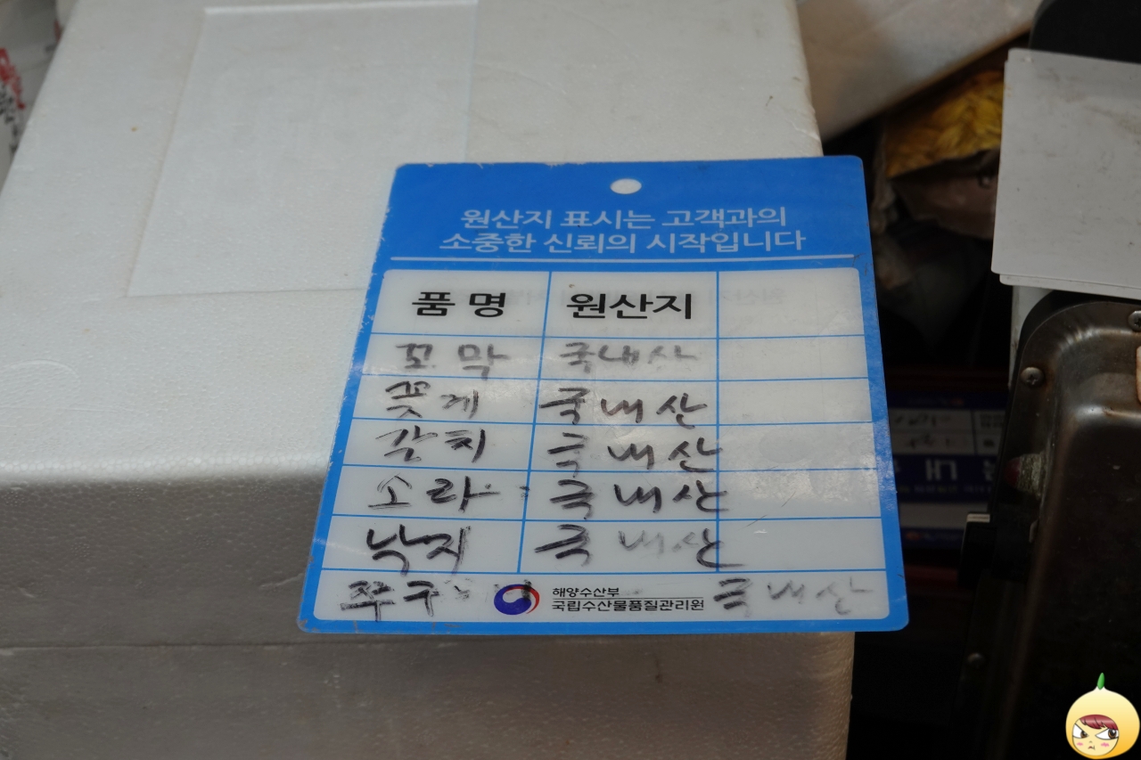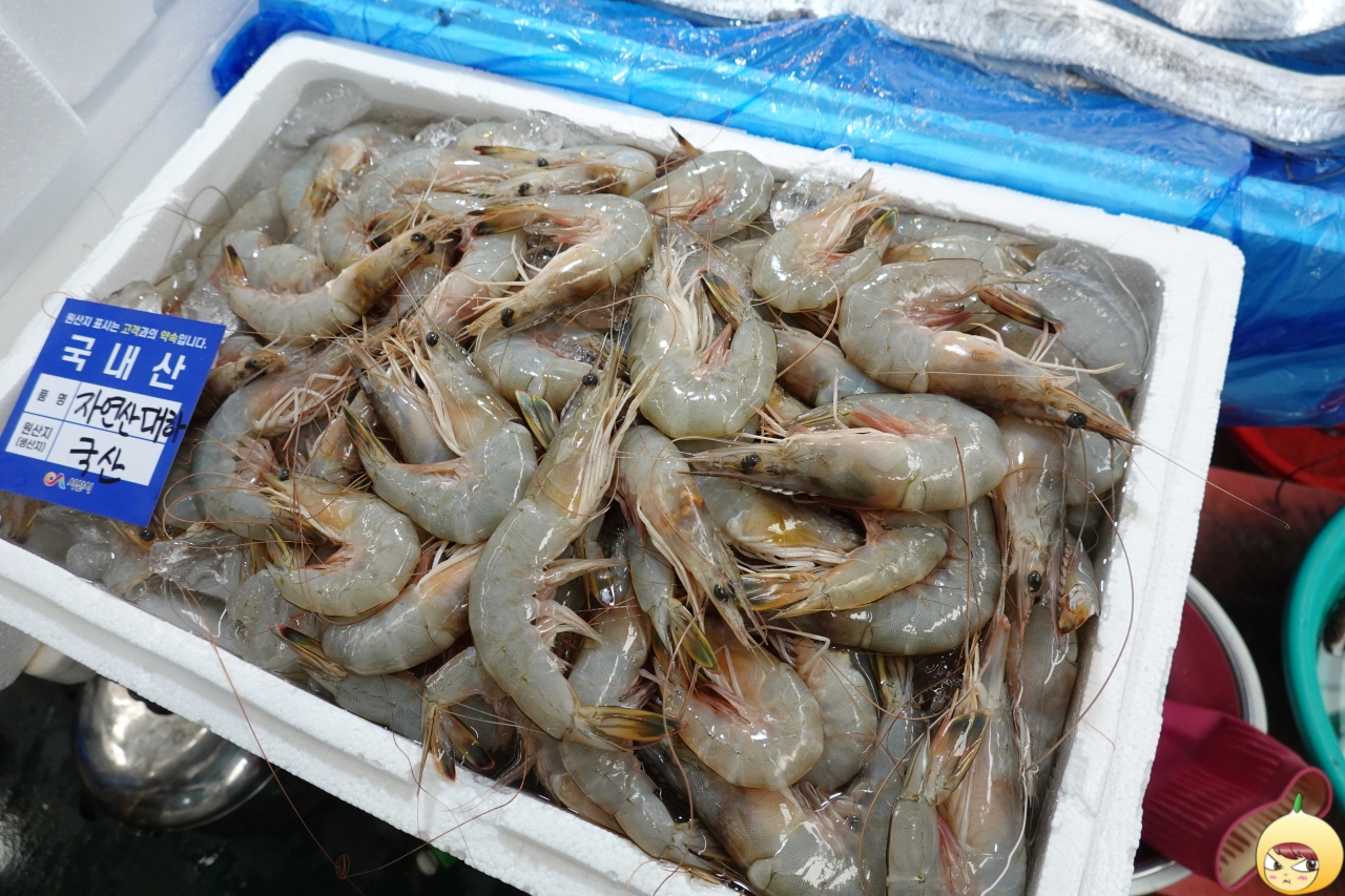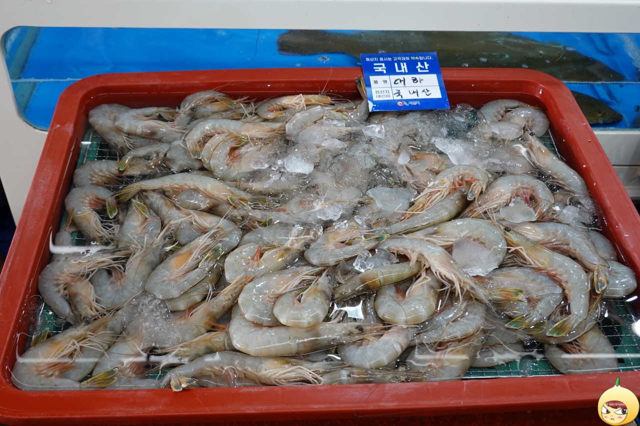 추천을 받았거나 원래부터 알던 곳은 아니다. 유명수산은 수조도 없고, 규모가 협소해서 스쳐 지나가려고 했는데, 저기 보이는 스티로폼 박스에 자연산 대하가 있다. 살아있는 대하(양식, 흰다리새우)를 파는 곳은 많았지만 자연산 대하는 여기서 처음 봤다.