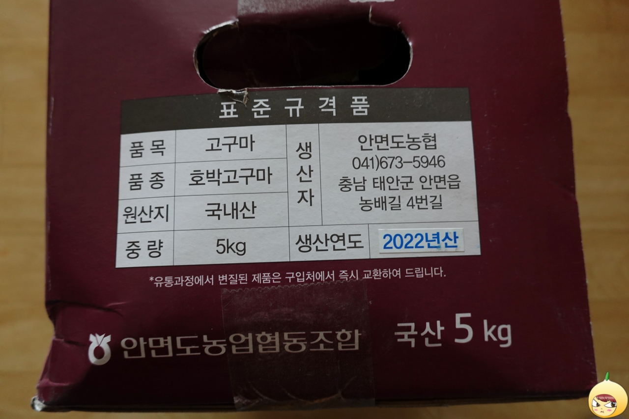 박스에 나와 있는 표준규격을 보니, 품목은 고구마, 품종은 호박고구마다. 원산지는 국내산으로 충남 태안군 안면도다. 중량은 5kg가 맞고, 생산연도는 2022년도로 묵은 호박고구마가 아닌 햇호박고구마다. 생산자가 사람 이름인 경우가 더 많았는데, 이번에는 안면도농협이다.