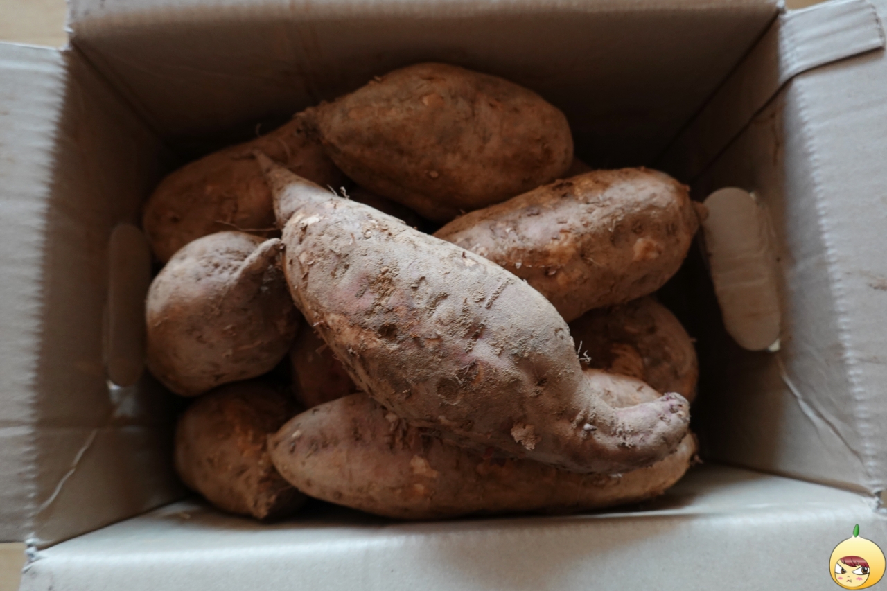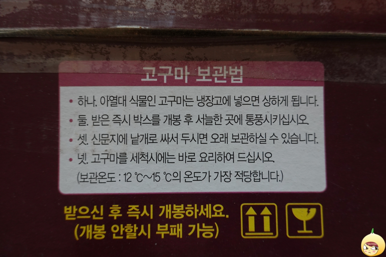주먹보다는 아이 팔뚝만한 호박고구마가 15개 그리고 자그마한 호박고구마가 한개 더 들어 있다. 태안 안면도 호박고구마가 유명한 이유는 안면도 마사토(물 빠짐을 좋게 한다) 황토(고구마를 튼실하게 만든다) 땅에서 육모장을 하고, 차별화된 재배기술을 보유하고 있다고 한다. 그리고 까다로운 선별로 좋은 상품을 고르고, 숙성으로 더 맛이 난단다.