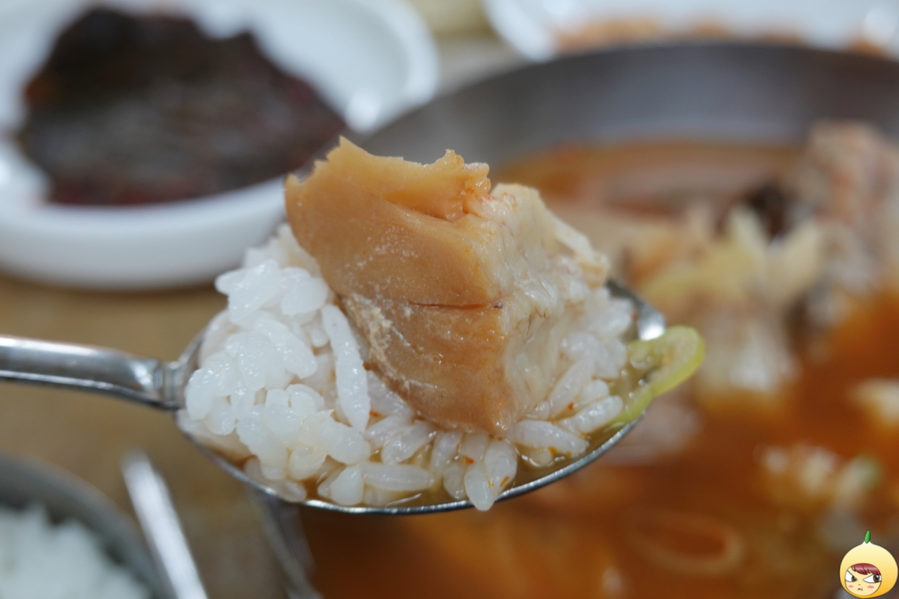 동태 몸통 부분을 먹고 난후, 뼈를 제거한 꼬리와 무는 숟가락으로 먹기 좋게 잘게 나눈다. 밑작업이 끝나면 곧바로 밥을 투하한다. 호호 불지 않아도 될 정도로 식은 동태탕에 밥을 말았으니, 카메라는 잠시 내려놓고 먹는데 집중한다. 남이있는 반찬을 더해 먹고 또 먹고, 땀까지 흘리면서 동태탕을 완탕했다.