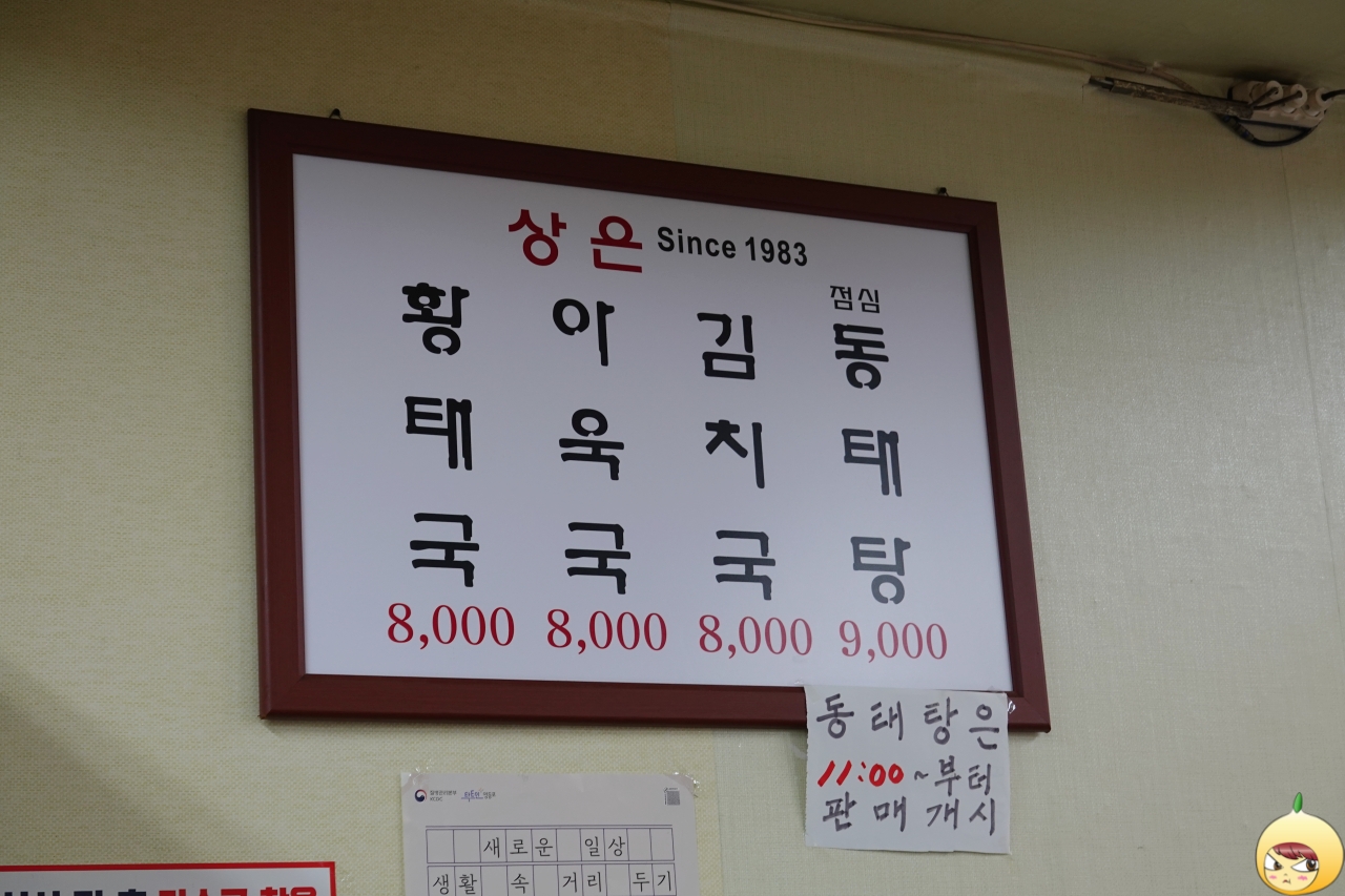 상호명이 상은북어국이라서, 황태국이 메인인 듯 싶으나 북엇국와 아욱국은 아침메뉴다. 고로 점심 메뉴인 동태탕(9,000원)을 주문했다. 메뉴판을 보면 술꾼들이 해장을 위해 엄청 많이 찾을 거 같은 느낌적인 느낌이 든다.