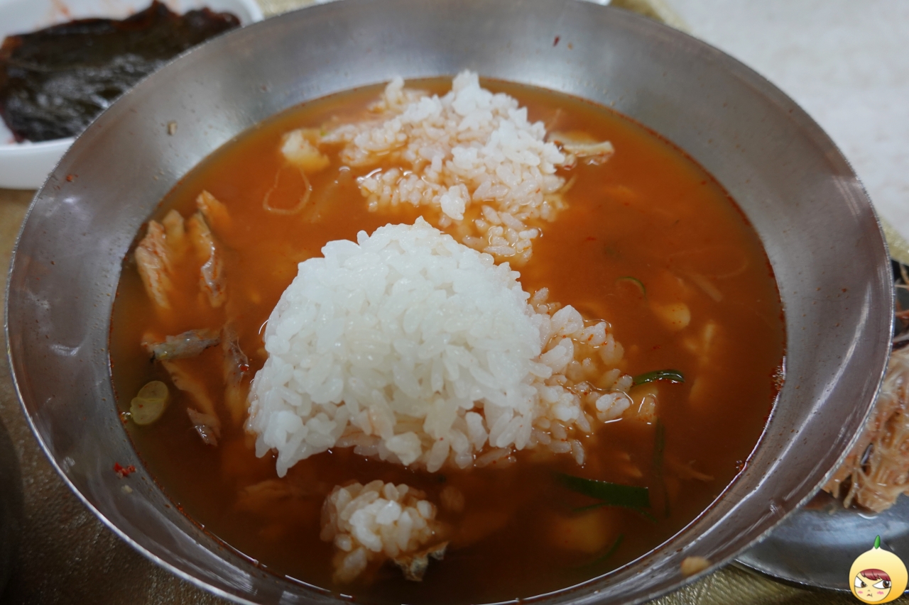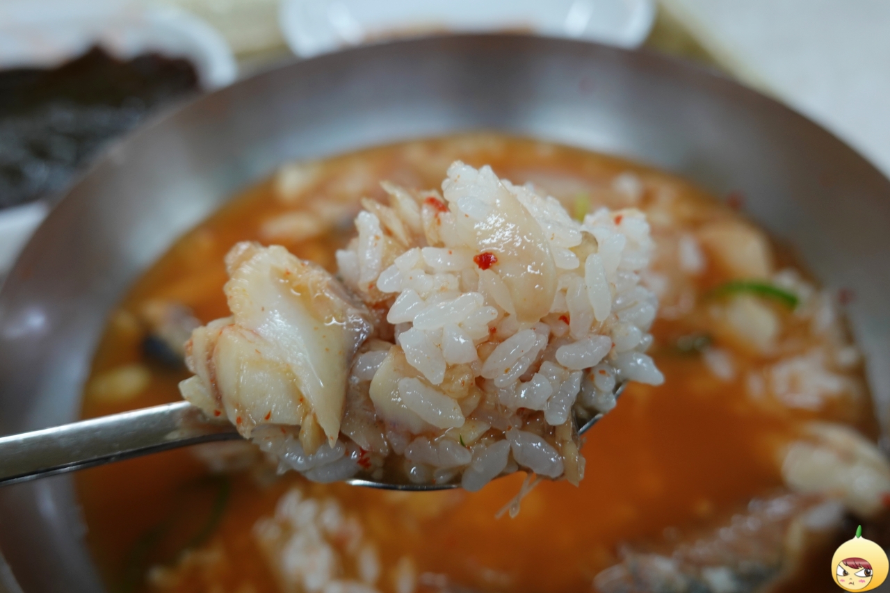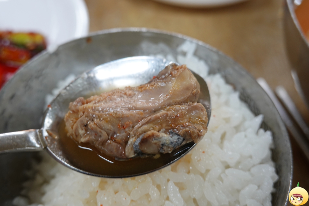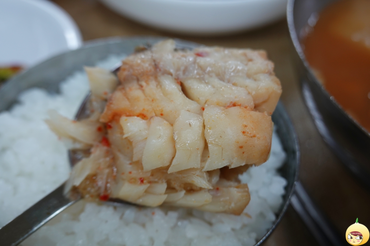 바로 말아서 먹어도 되지만, 깔끔한 국물을 좀 더 느끼고 싶어 국물에 밥을 적셔서 먹는다. 이때 동태살 한 점은 무조건 무조건이다. 간은 슴슴하다 할 정도로 세지 않고, 비린내 따위는 일절 없다.