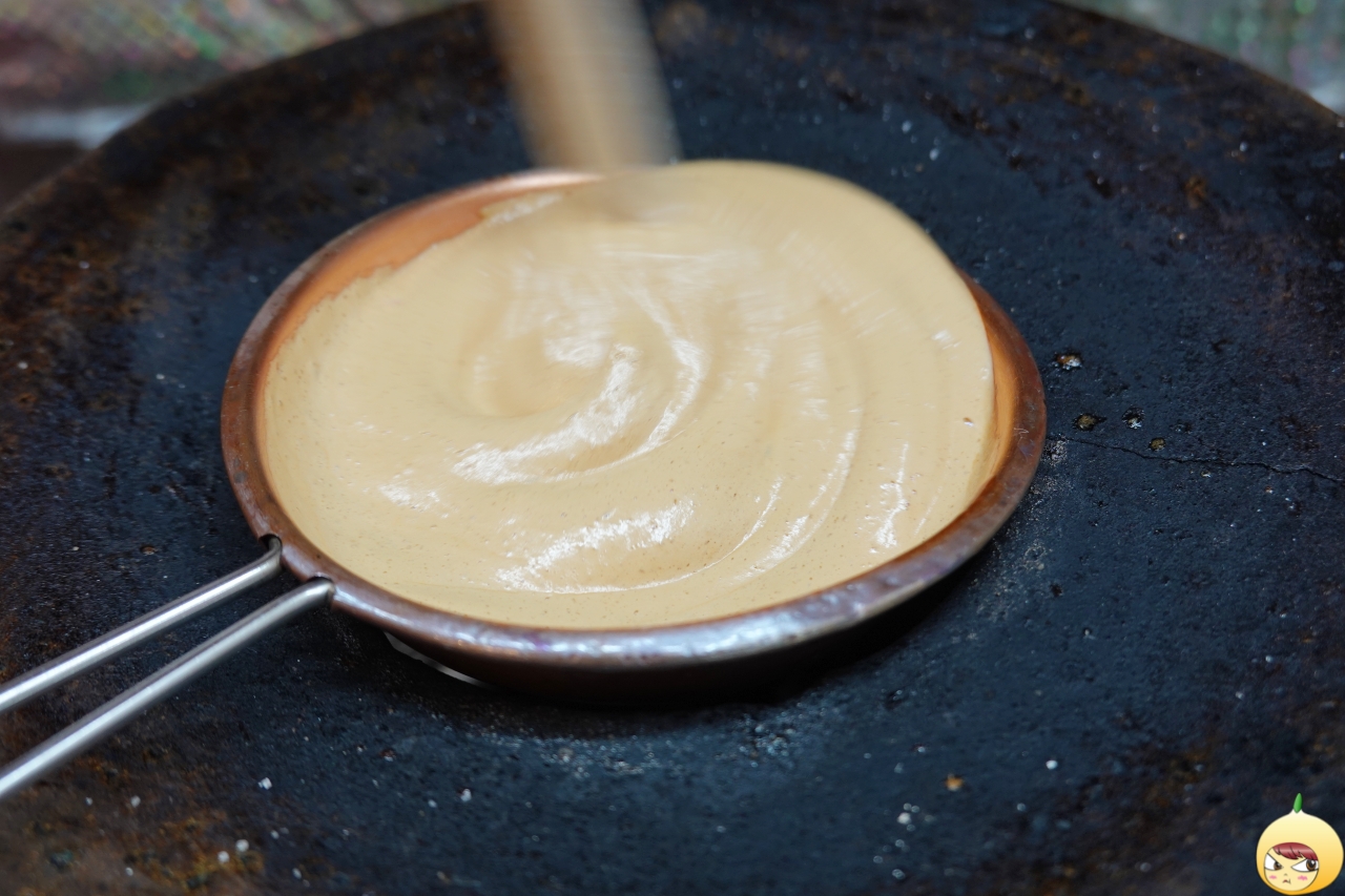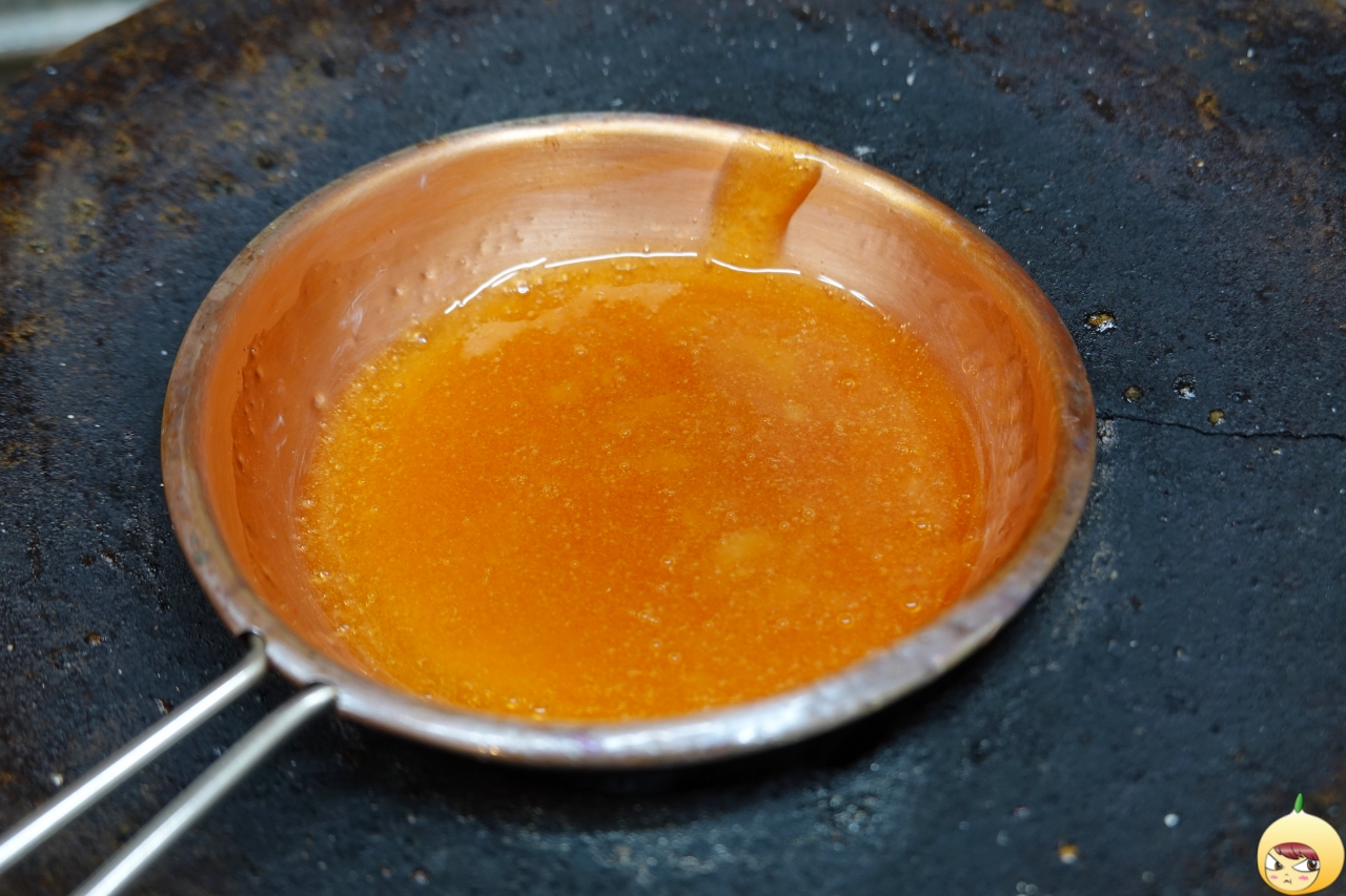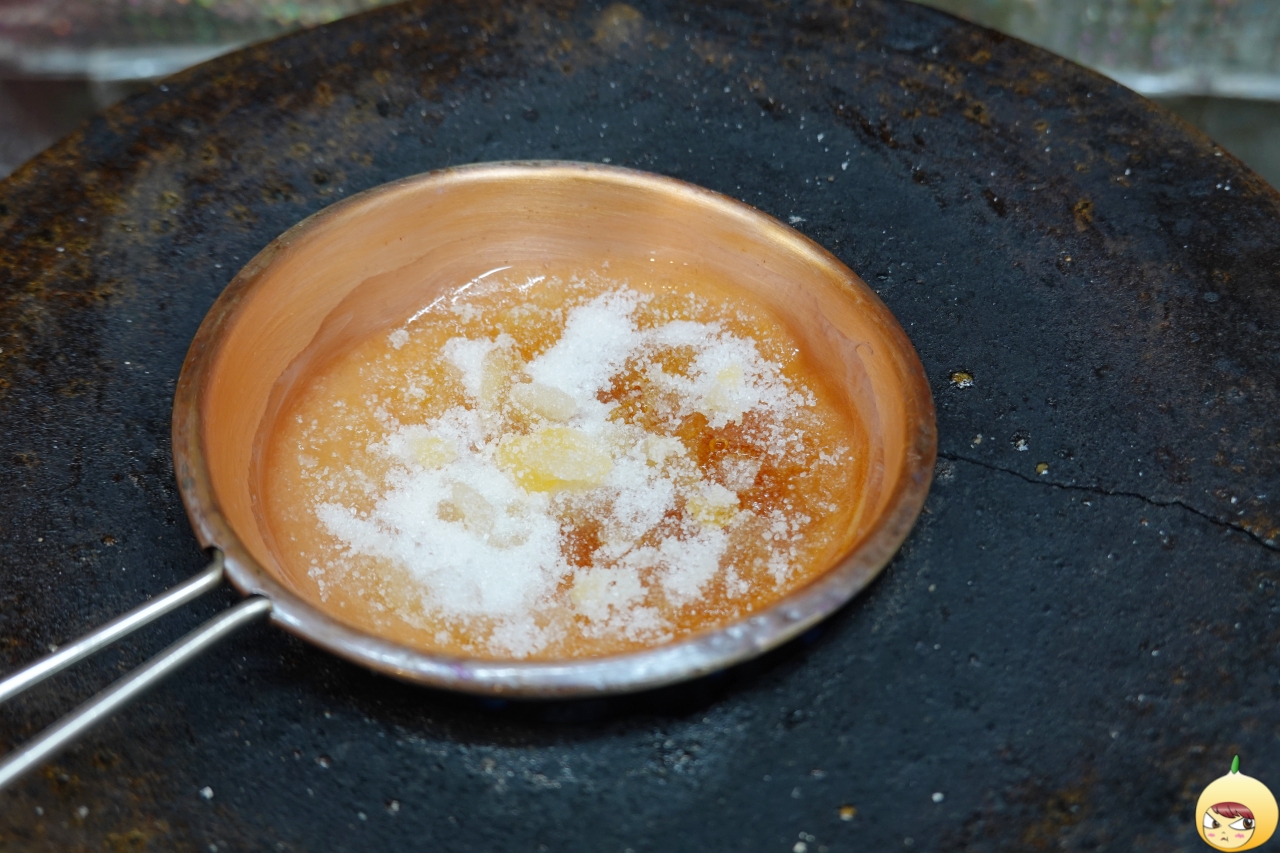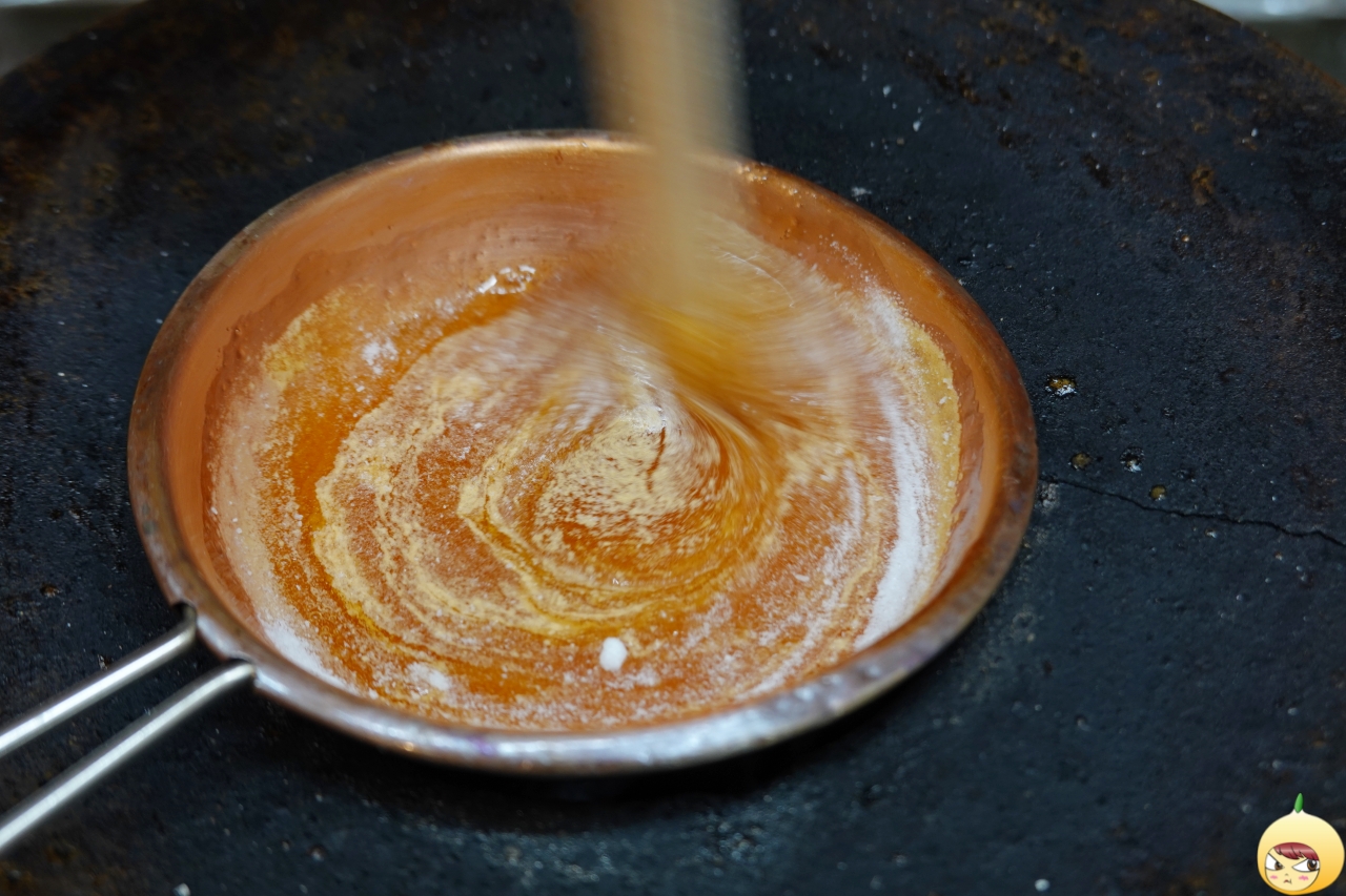 예전에는 설탕을 넣자마자 젓가락을 휘저었다고 하니, 그때는 설탕을 조금만 줘서 그런 거란다. 지금은 양을 넉넉히 주는데, 녹기도 전에 휘저으면 탄맛이 날 수 있다고 한다. 서서히 녹기 시작하면 가장자리부터 젓가락을 톡톡 눌러주면 된다.