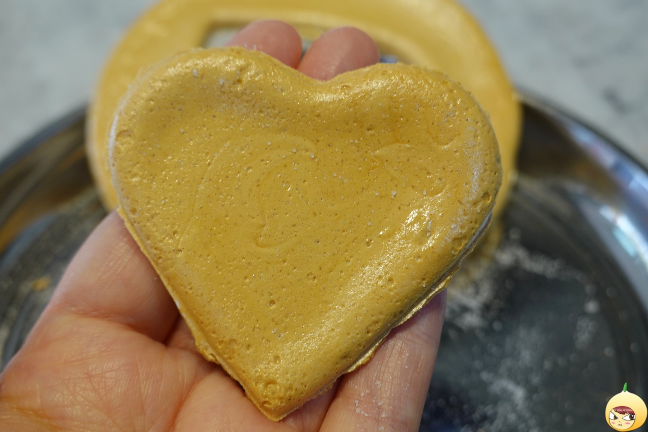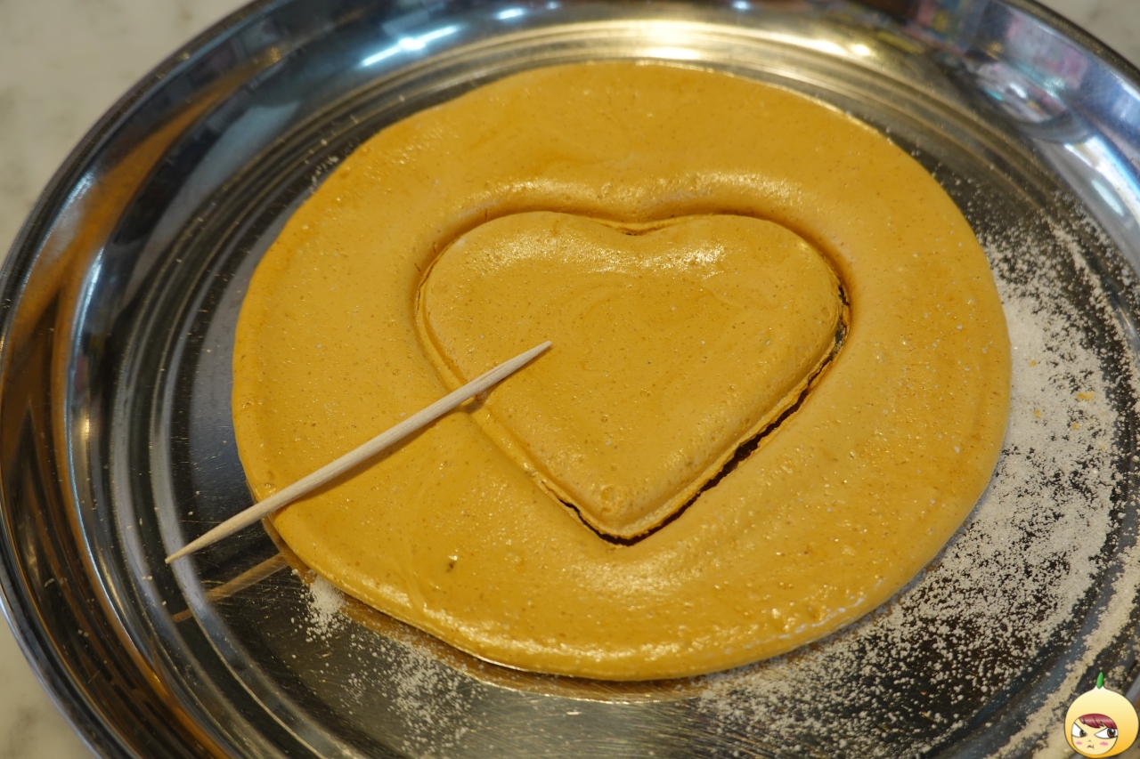 어릴 때는 성공보다는 실패가 많았는데, 지금은 오징어 게임처럼 뒤집어서 침을 바르지 않아도 이쑤시개로 몇번 톡톡하니 완벽하게 분리가 됐다. 쉬운 모양을 선택해서 그런 줄 알았는데 주인장 왈, 요즈음 백이면 백 성공할 수 있도록 모양틀을 누를때 힘을 많이 준단다. 찍은 사진을 다시 확인하니, 하트 모양틀을 찍었을 뿐인데 벌써 떨어진 부분이 많이 보인다.