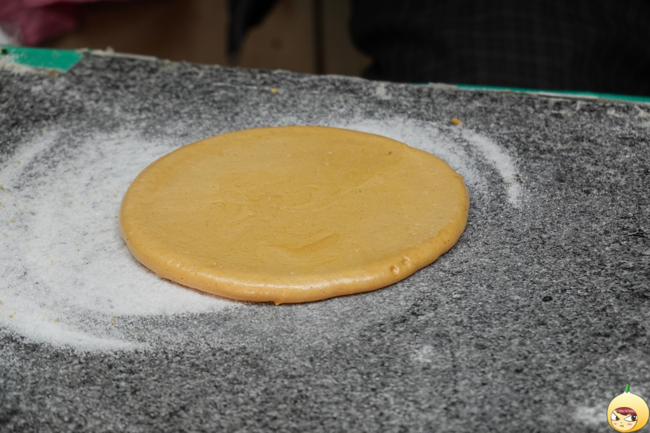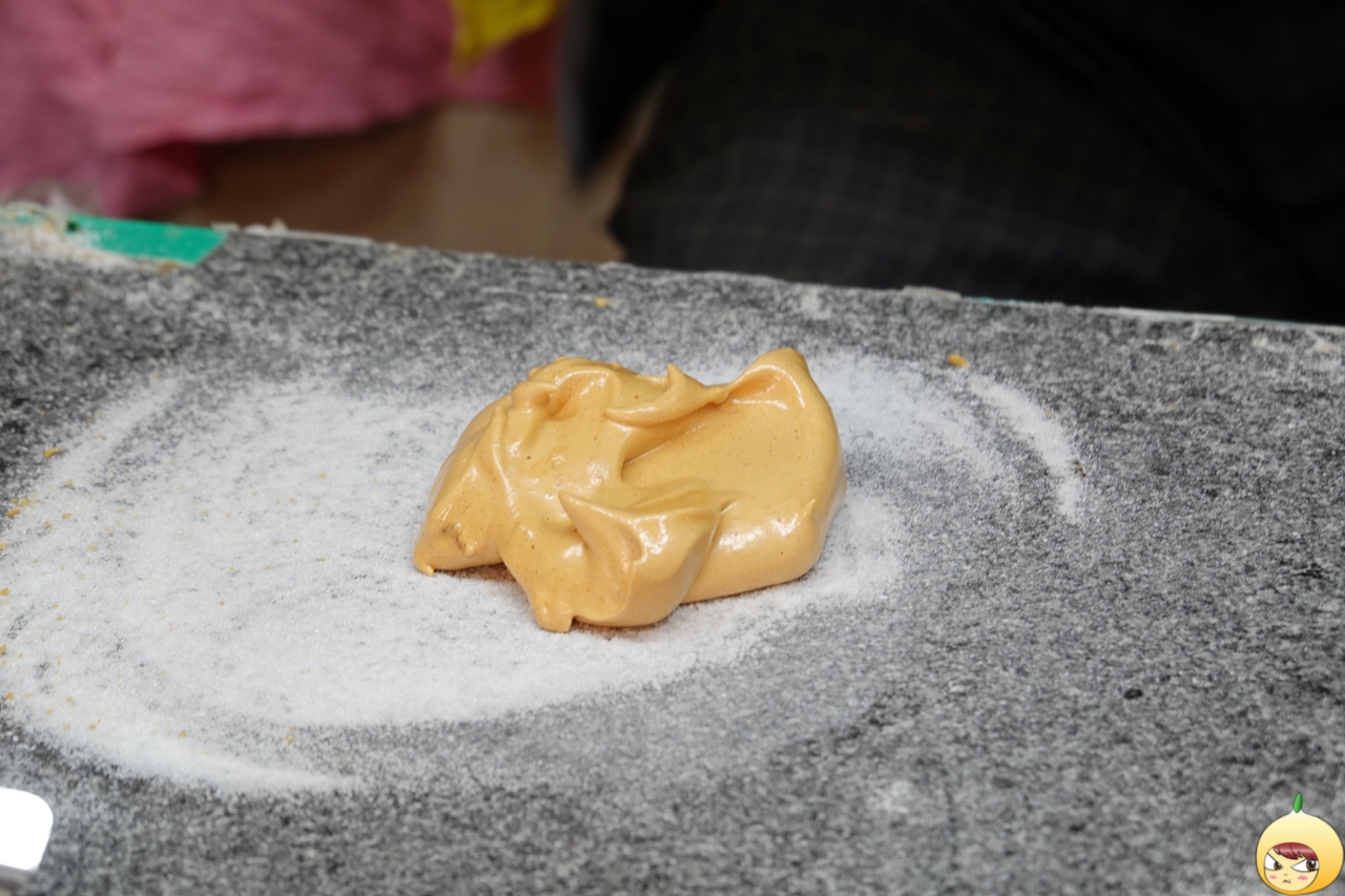 어릴때 해서 방법은 다 알고 있는데, 다시 하니 새롭다. 녹은 설탕물에 소다만 넣었을 뿐인데 마치 빵반죽이 부풀듯 국자에 넘칠 정도로 달고나가 많아졌다. 체험이니 직접 다 해야 하지만, 사진을 찍어야 해서 나름 정교한 작업은 주인장에게 해달라고 부탁드렸다.