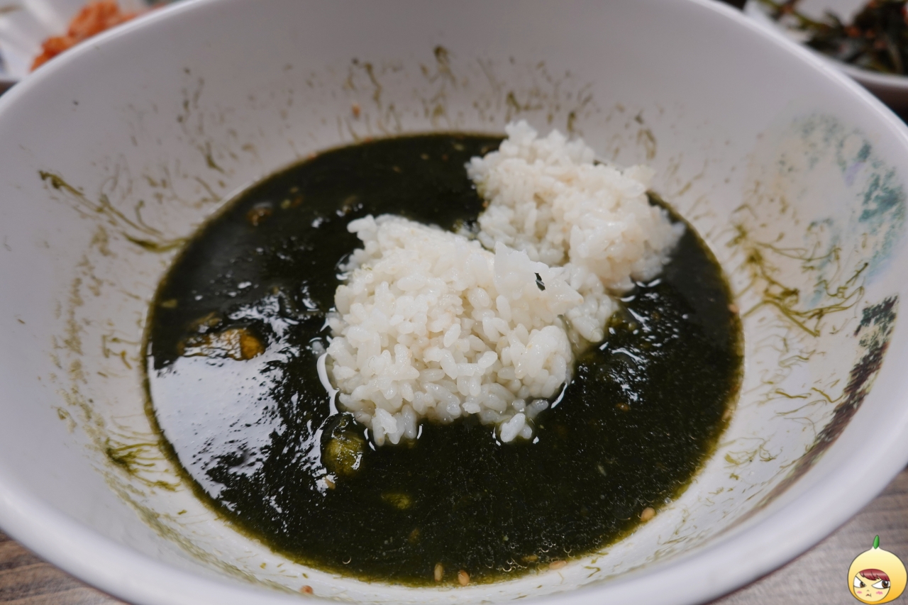 매생이국이 20~30% 남았을때 밥을 투하한다. 매생이는 밥알 사이사이 침투해서 나중에 온 손님(?)을 극진히 모신다. 굳이 밥을 말아서 먹을 필요는 없지만, 이렇게 먹으면 후루룩 후루룩 빨리 먹을 수 있다.